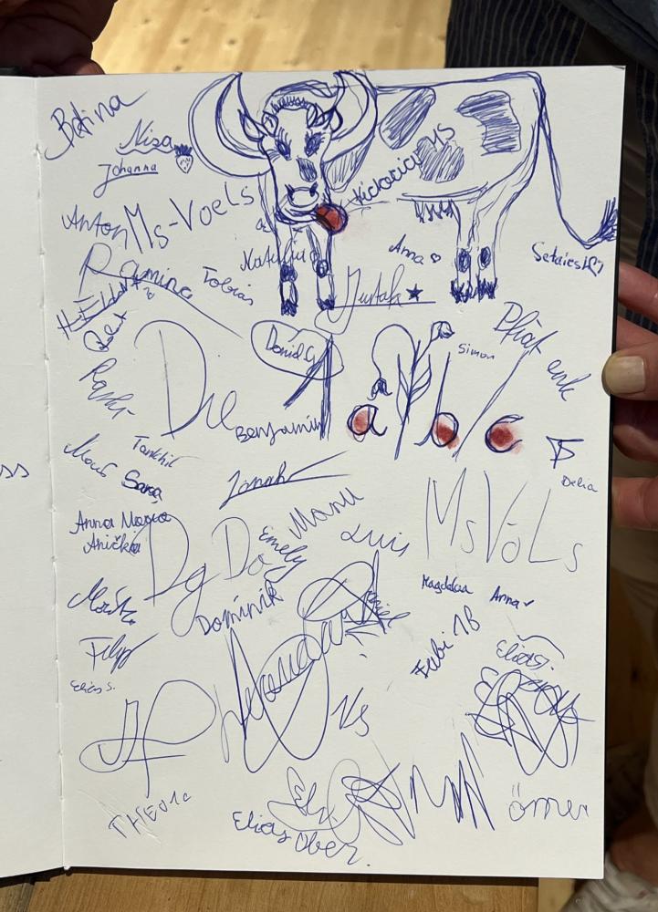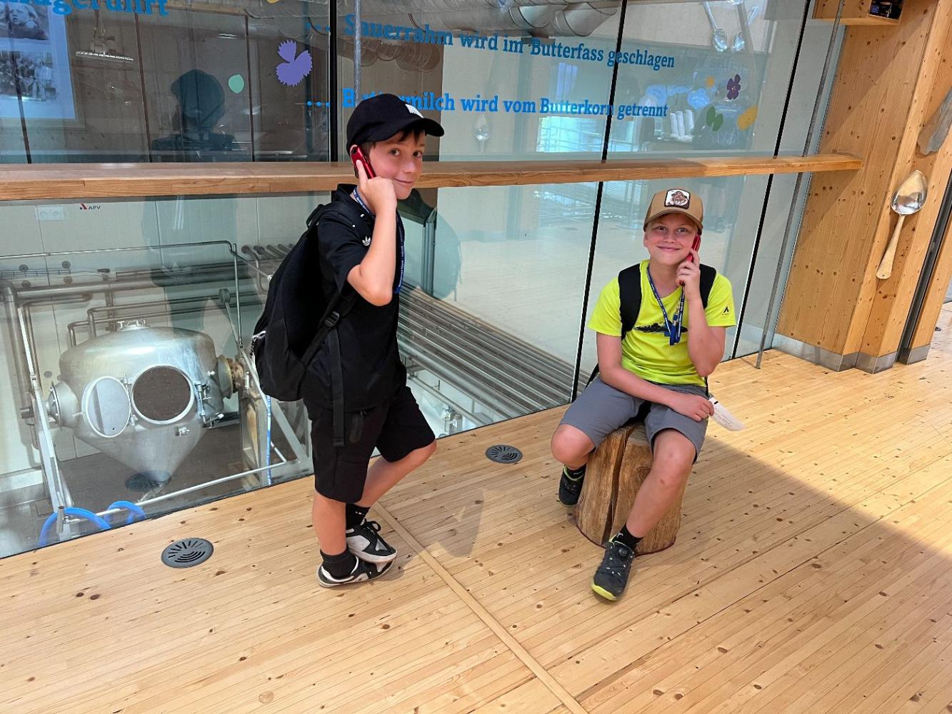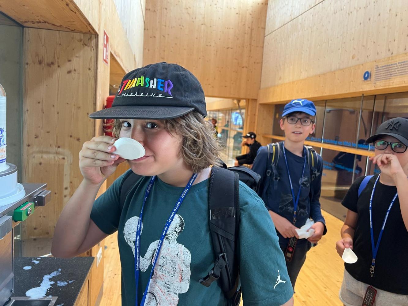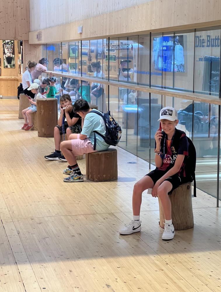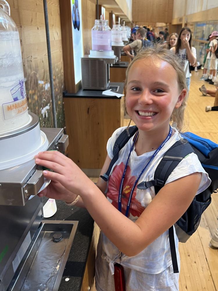 Vor Ort erwartete die Schülerinnen und Schüler ein abwechslungsreiches Programm. In der modernen, gläsernen Schau-Sennerei konnten sie mit einem Audioguide in die Welt der Heumilchverarbeitung eintauchen und erfuhren, wie aus frischer Milch köstlicher Käse und cremiger Joghurt entsteht. Der Höhepunkt für viele war sicher die Verkostung verschiedener Käsesorten an den Käsomaten und verschiedener Joghurts beim Genusslöffeln. Es durfte nach Herzenslust probiert werden.