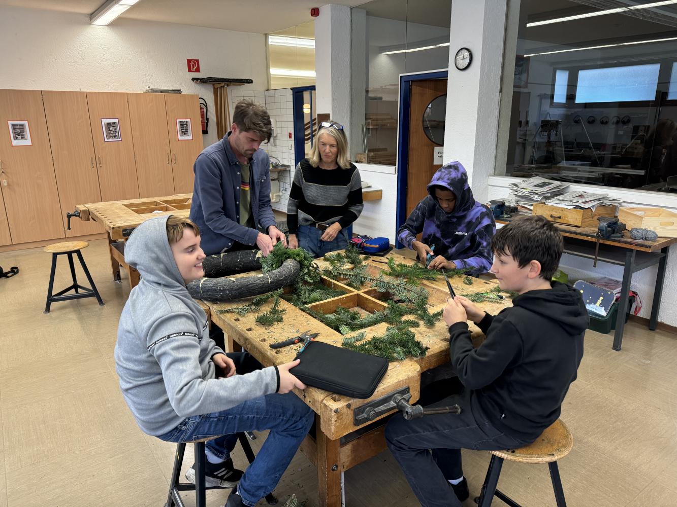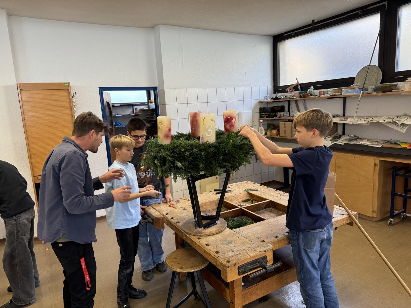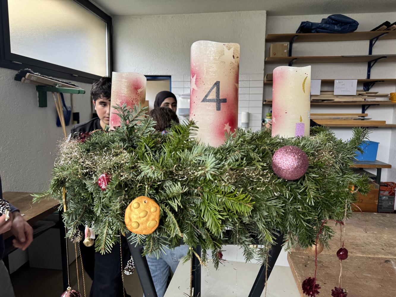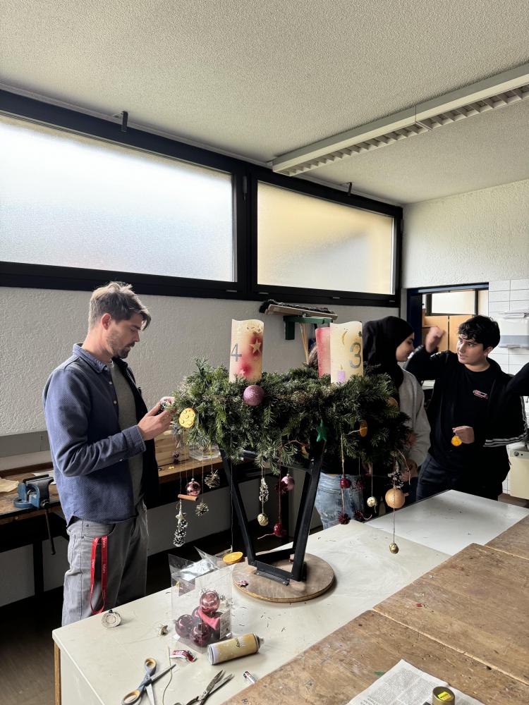 Der Adventkranz der Schule war heuer ein Projekt des Technik und Design (TuD) Unterrichts der 3. Klassen unter Leitung von Herrn Weber und Frau Zamani. Sowohl das Flechten der Tannenzweige als auch die Gestaltung mit selbstgebastelten, weihnachtlichen Dekorationselementen wurde zur Gänze von den Schüler:innen übernommen. Ziel war es, Tradition mit modernem Weihnachtskult zu vereinen. Der Kranz kann ab sofort im Eingangsbereich der Schule bewundert werden.
