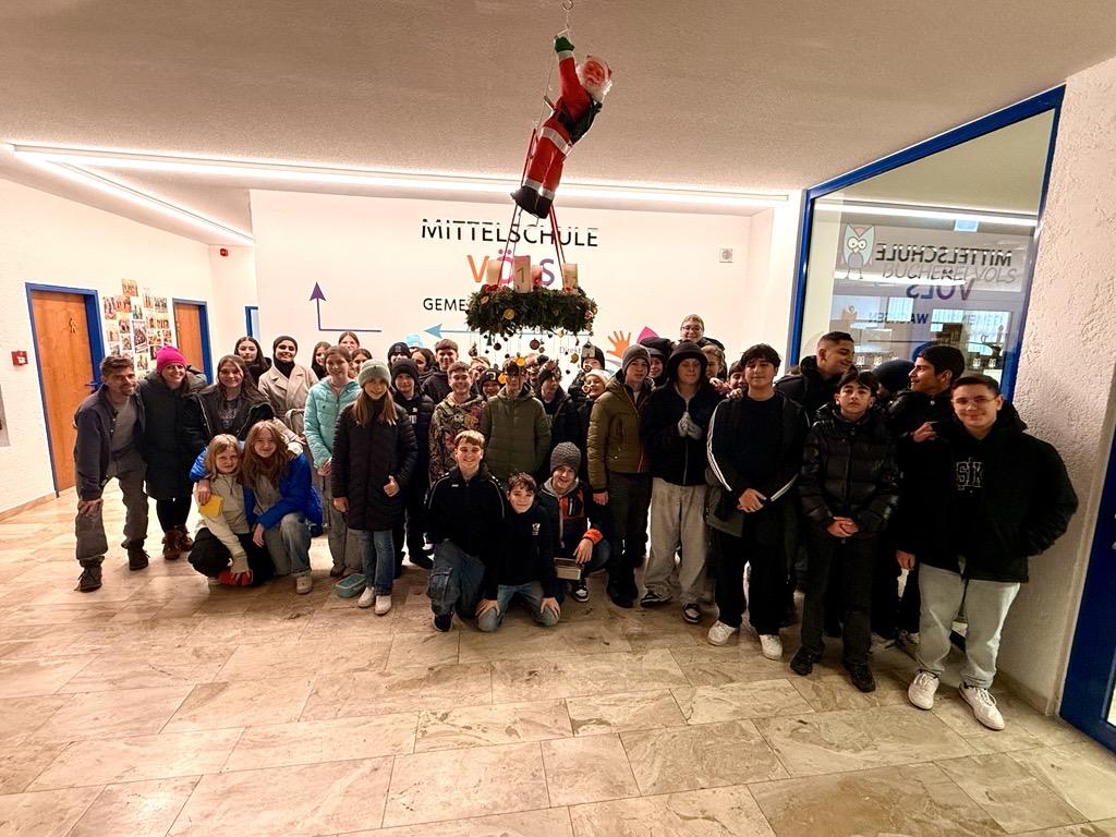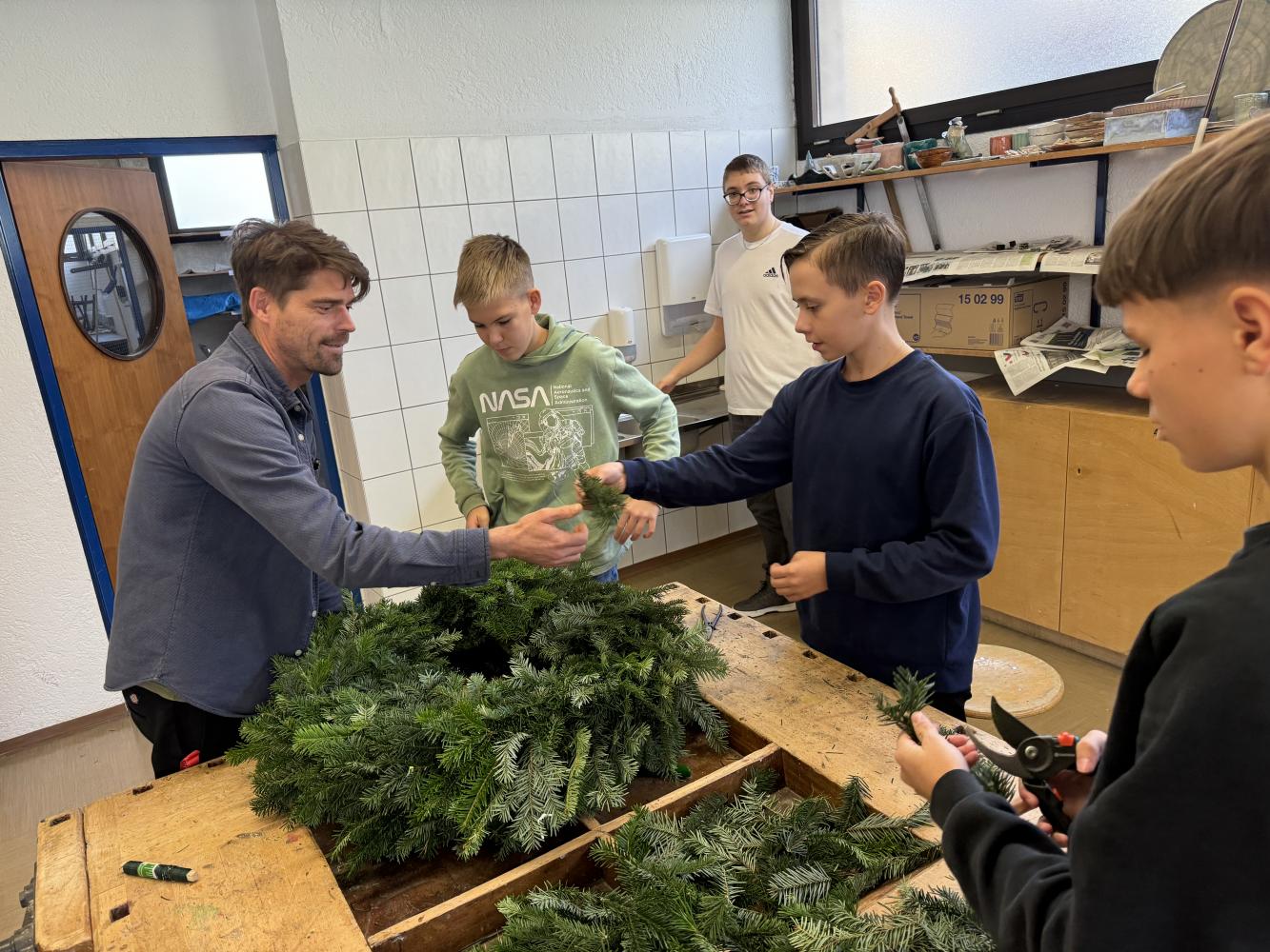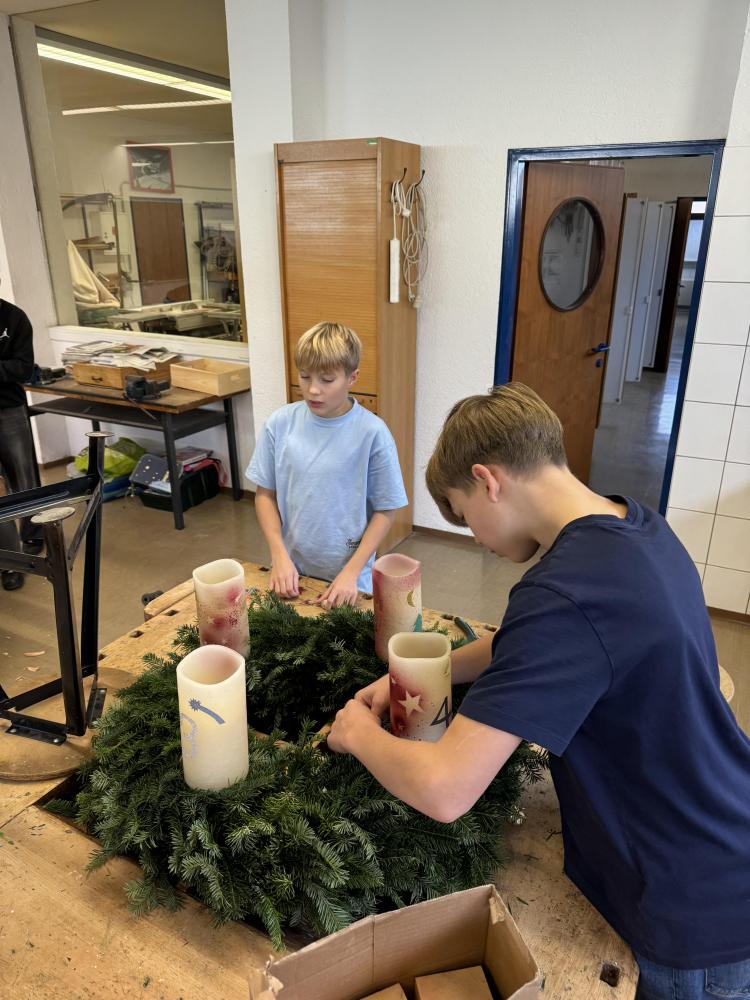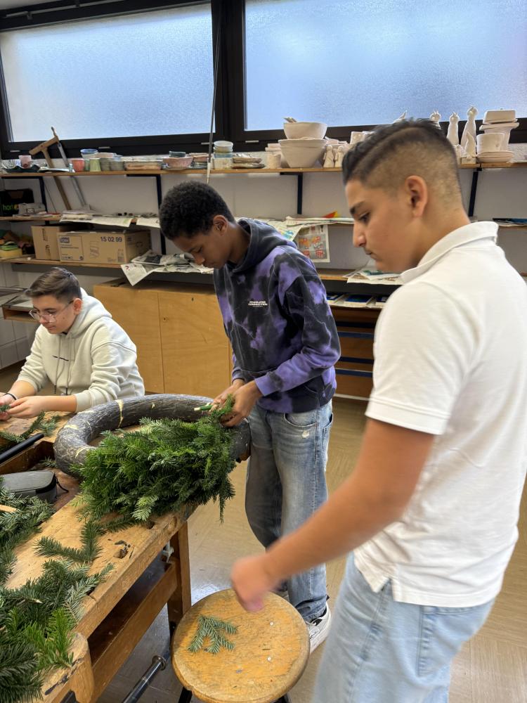 Der Adventkranz der Schule war heuer ein Projekt des Technik und Design (TuD) Unterrichts der 3. Klassen unter Leitung von Herrn Weber und Frau Zamani. Sowohl das Flechten der Tannenzweige als auch die Gestaltung mit selbstgebastelten, weihnachtlichen Dekorationselementen wurde zur Gänze von den Schüler:innen übernommen. Ziel war es, Tradition mit modernem Weihnachtskult zu vereinen. Der Kranz kann ab sofort im Eingangsbereich der Schule bewundert werden.