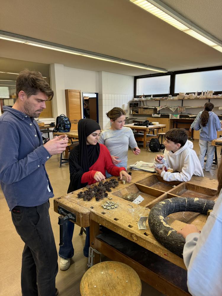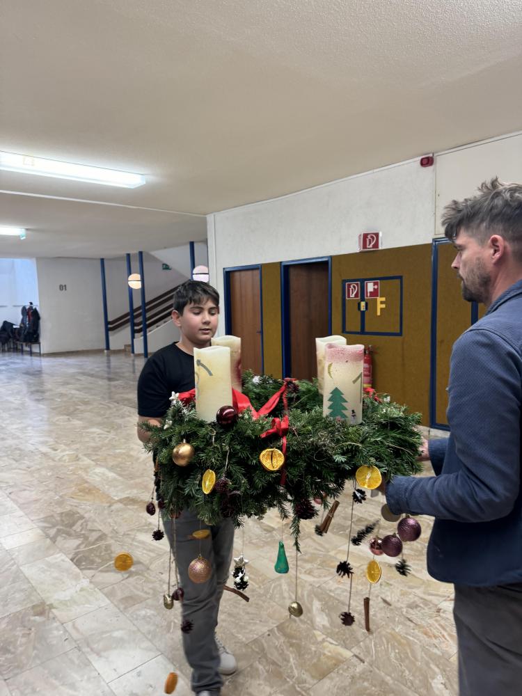 Basteln der Dekoration: Mitte November wurden weihnachtliche Tonobjekte angefertigt, welche eine Woche später bemalen wurden. Kiefernzapfen wurden selbst gesammelt und gold oder rot angesprüht. Deni Apaevs Erfindergeist kreierte Schneemänner aus den Zapfen. Kastanien wurden durchbohrt und ebenfalls Gold gefärbt. Orangen und Mandarinen wurden geschnitten, getrocknet. Die Dekoration war also vorbereitet. Eigentlich wollten die Schüler:innen auch die Kerzen selbst gießen, da “echte” Wachskerzen zum Anzünden aufgrund der Bandschutzordnung nicht erlaubt sind, wurden große LED Kerzen gekauft und diese wurden kreativ weihnachtlich mit Glitzerpapier und Spray gestaltet.