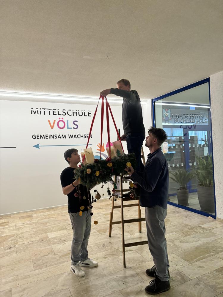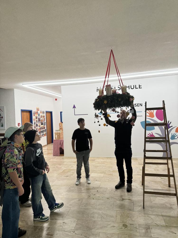 Zu guter Letzt - das Aufhängen: Unser lieber, hilfsbereiter Schulwart Hannes befestigte den Kranz an roten Bändern und hängte ihn im Eingangsbereich an der Decke, wo er bereits ab heute bewundert werden kann.