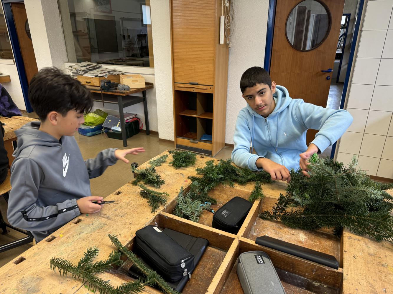 Nun ging es ans Flechten: Die Zweige stammen von einer Silbertanne aus dem Brixental und wurden dort gemäß der Tradition zu Vollmond abgezwickt, um eine möglichst lange Festigkeit der Nadeln zu gewähren. Die Schüler:innen zwickten nun froh und heiter aus den großen Ästen die Zweige klein.