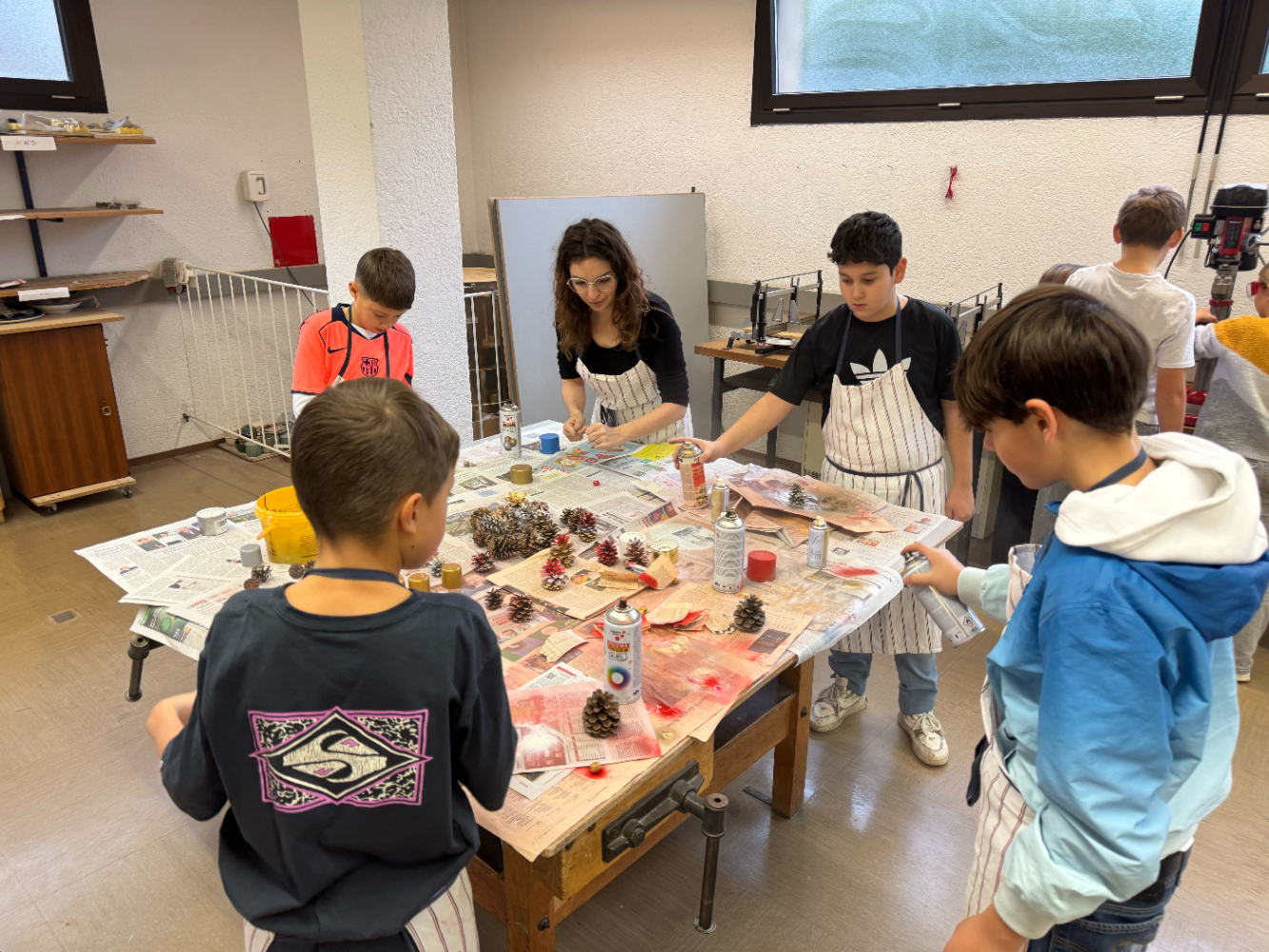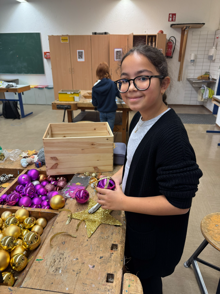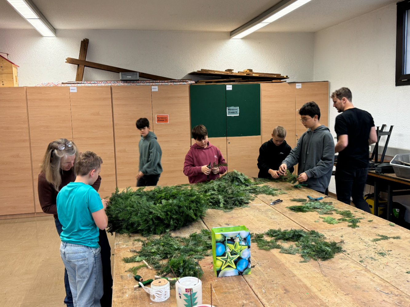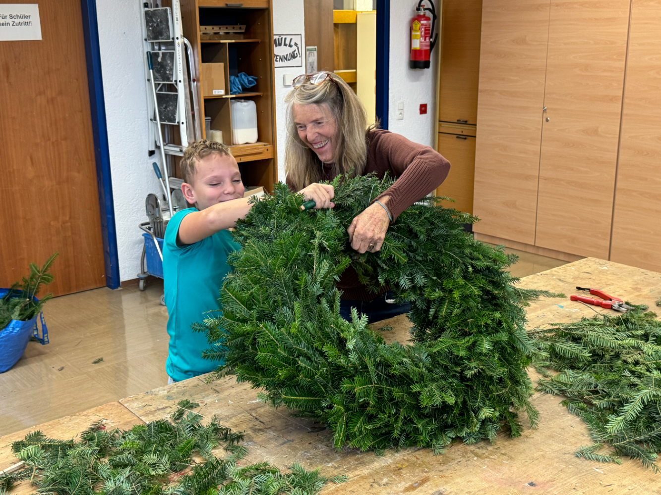 Den Auftakt machten die Schülerinnen und Schüler der 1a. Gemeinsam mit der Expertin Anna Mitteregger, Mutter unserer Lehrerin Frau Zamani, wurden unzählige Tannenzweige gezwickt und sorgfältig am Adventskranz befestigt. Währenddessen entstanden im Nebenraum die ersten dekorativen Elemente: