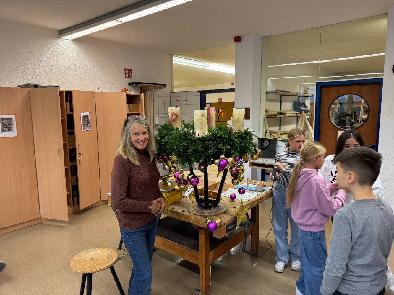 In der dritten und vierten Stunde übernahm die 1b. Sie gab dem Adventskranz seine letzten grünen Schichten und führte die Dekoarbeiten weiter. Nun wurden die einzelnen Gestaltungselemente zu ansprechenden Kombinationen gebunden – etwa mit Zimtstangen und Orangenscheiben. Die grell glitzernden Kugeln bekamen damit einen natürlichen Ausgleich, der dem Kranz seinen besonderen Charme verleiht.