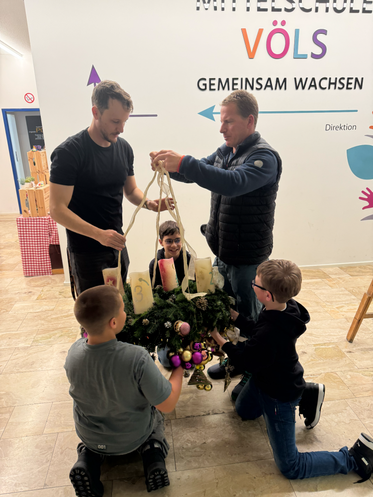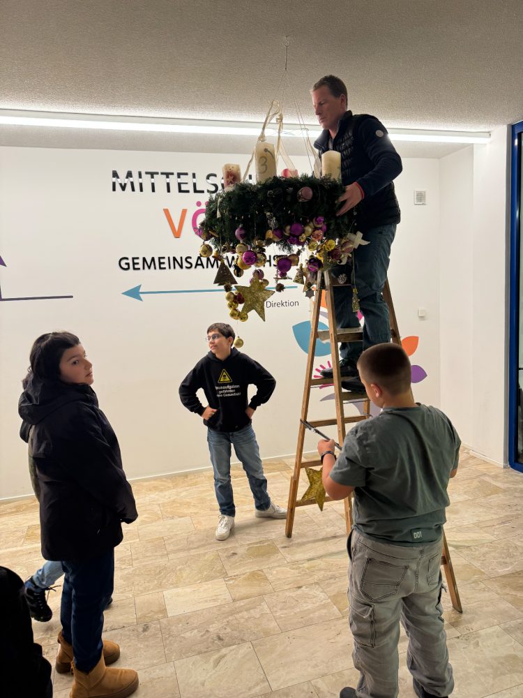Die fünfte und sechste Stunde gehörte der 1c. Sie schmückte den Adventskranz final und stellte zusätzlich die Dekoration für den Stiegenaufgang fertig. Die liebevoll arrangierten Zweige und Dekostücke verbreiten ab sofort adventlichen Zauber im gesamten Schulhaus.