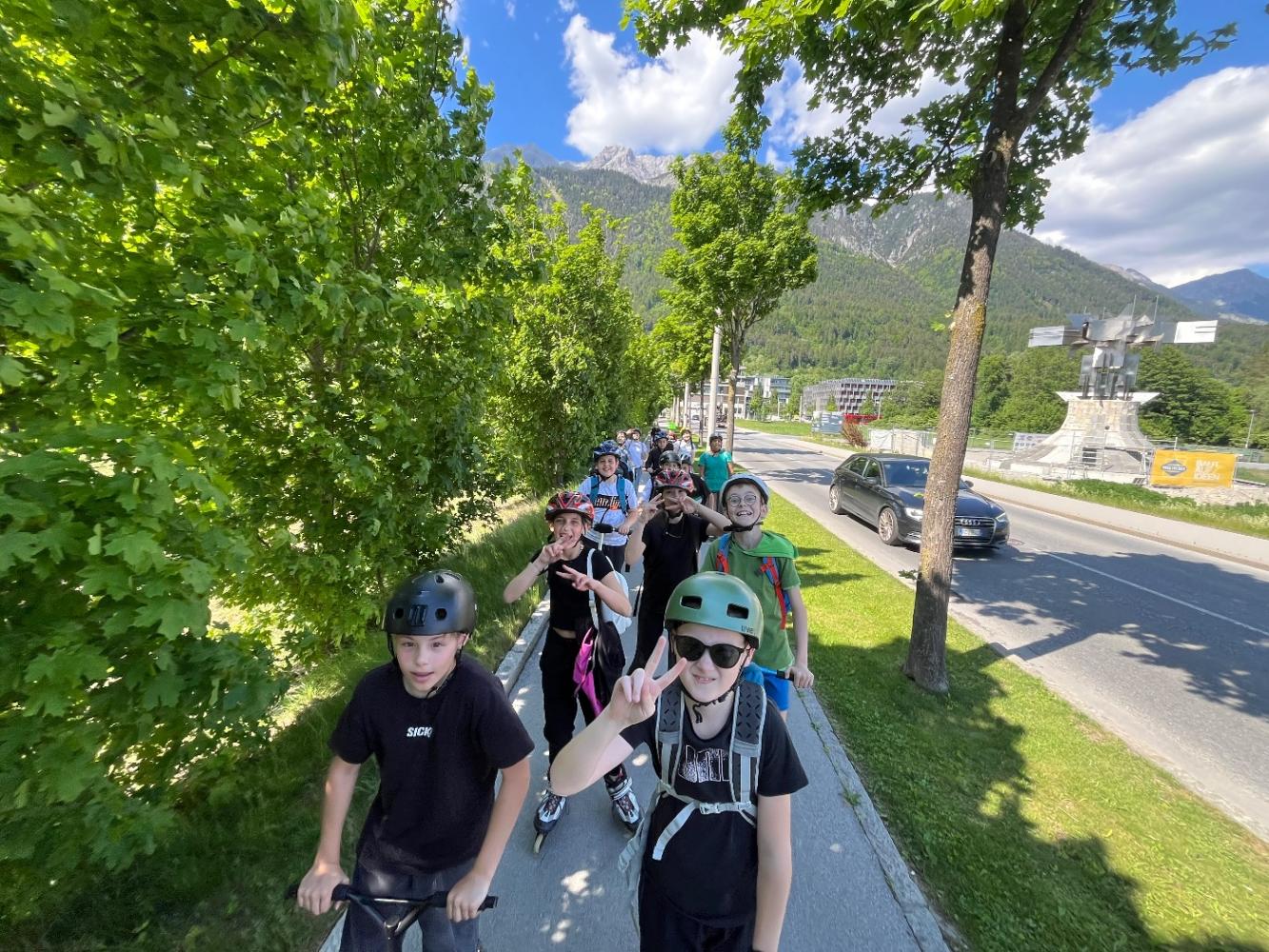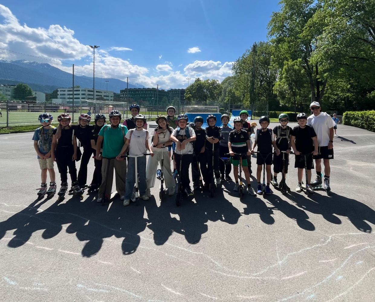 Heute war ein aufregender Tag für die Schülerinnen und Schüler der Mittelschule Völs! Im Rahmen der unverbindlichen Übung Sport machten wir uns auf den Weg zum Skaterpark in Hötting West. Ausgestattet mit Inlineskates und Scootern erlebten die Kinder einen Tag voller Spaß und Bewegung.