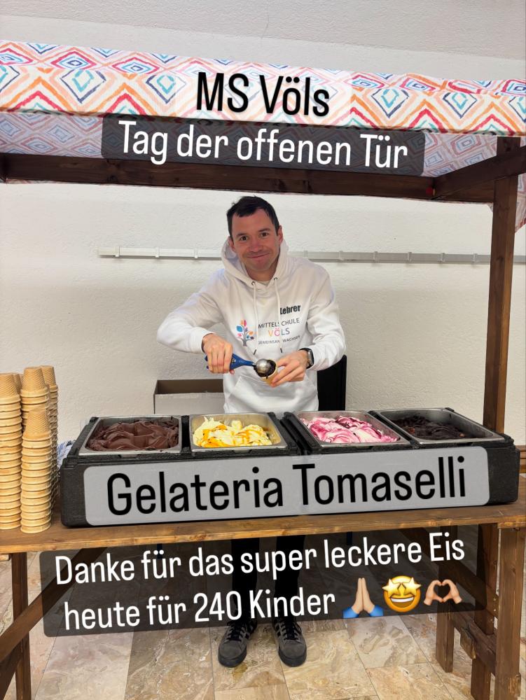 - Dezember 2025: Auch heuer durften sich die Kinder der Mittelschule Völs sowie die Kinder der 4. Klasse Volksschule am Tag der offene Tür über das super leckere Eis freuen.