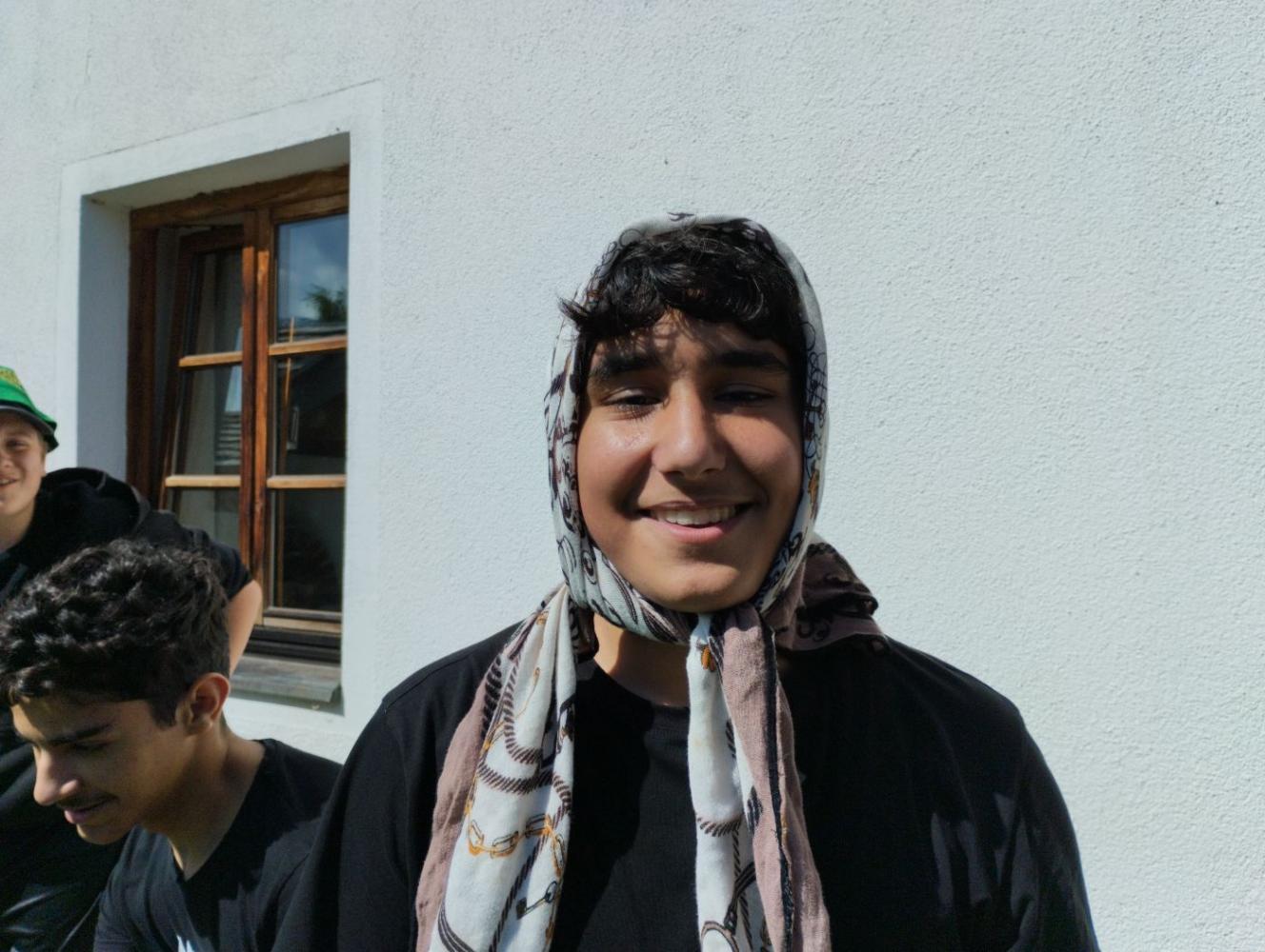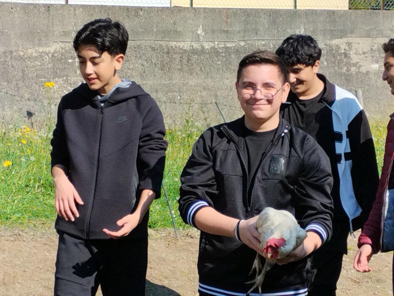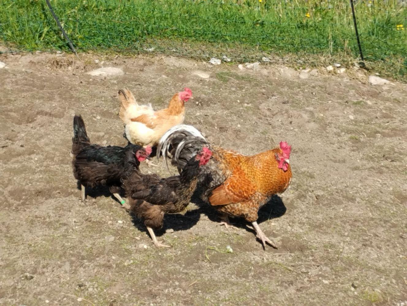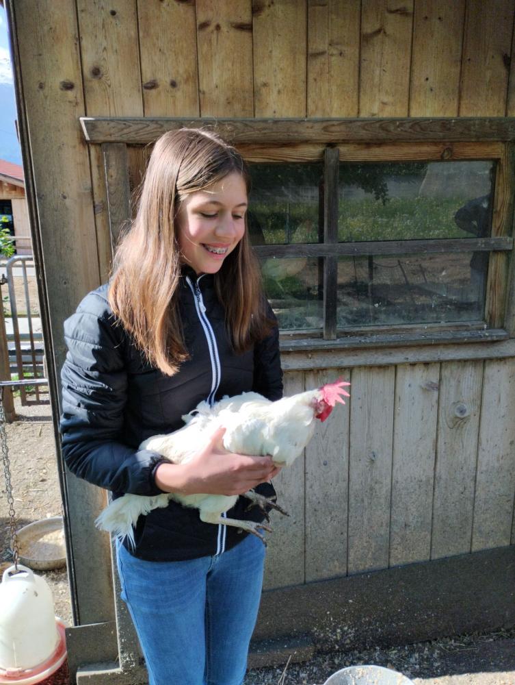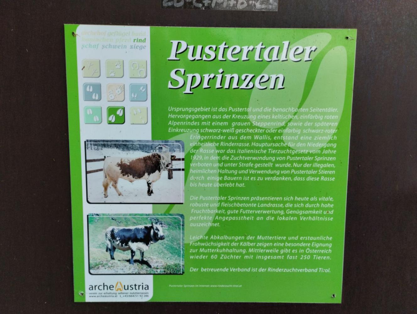 Nach einer kleinen Einführung zeigte uns die Bäuerin Johanna Strasser auf einem Rundgang den modernen Freilauf-Stall der Rinder, den ursprünglichen Stall, den Heustadel, das Hühnergehege, die Bienenstöcke und die Schafweide. Auf dem Hof werden sogenannte Arche-Tiere gezüchtet, das sind Rassen, die vom Aussterben bedroht sind. So werden dort „Pustertaler Sprinzen“ und Schwarzkopfschafe gehalten. Den Schüler*innen wurde die Haltungsform, der Nutzen, die Fütterung und andere Details zur jeweiligen Tierart nähergebracht. Im Hühnergehege durften sie in Gruppen versuchen, ein Huhn zu fangen und bereits gelegte Eier konnten aus dem Nest geholt werden.