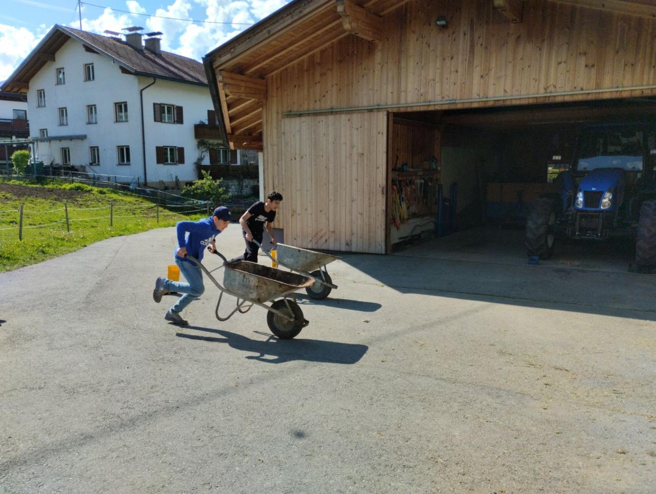 Ein Highlight neben der gemeinsam zubereiteten Jause war sicher, dass sich jeder einmal in einen der Traktoren setzen durfte. Aufgelockert wurde die lehrreiche und kurzweilige Veranstaltung durch ein paar Spiele: Ein „Bauer“ und eine „Bäuerin“ mussten gemeinsam die Hühner einfangen und rohe Eier mussten jeweils von 2 Staffeln mit einem Schubkarren heil und möglichst schnell ins Ziel gebracht werden.