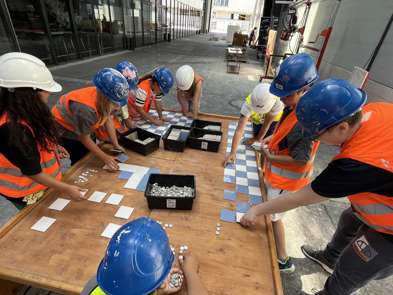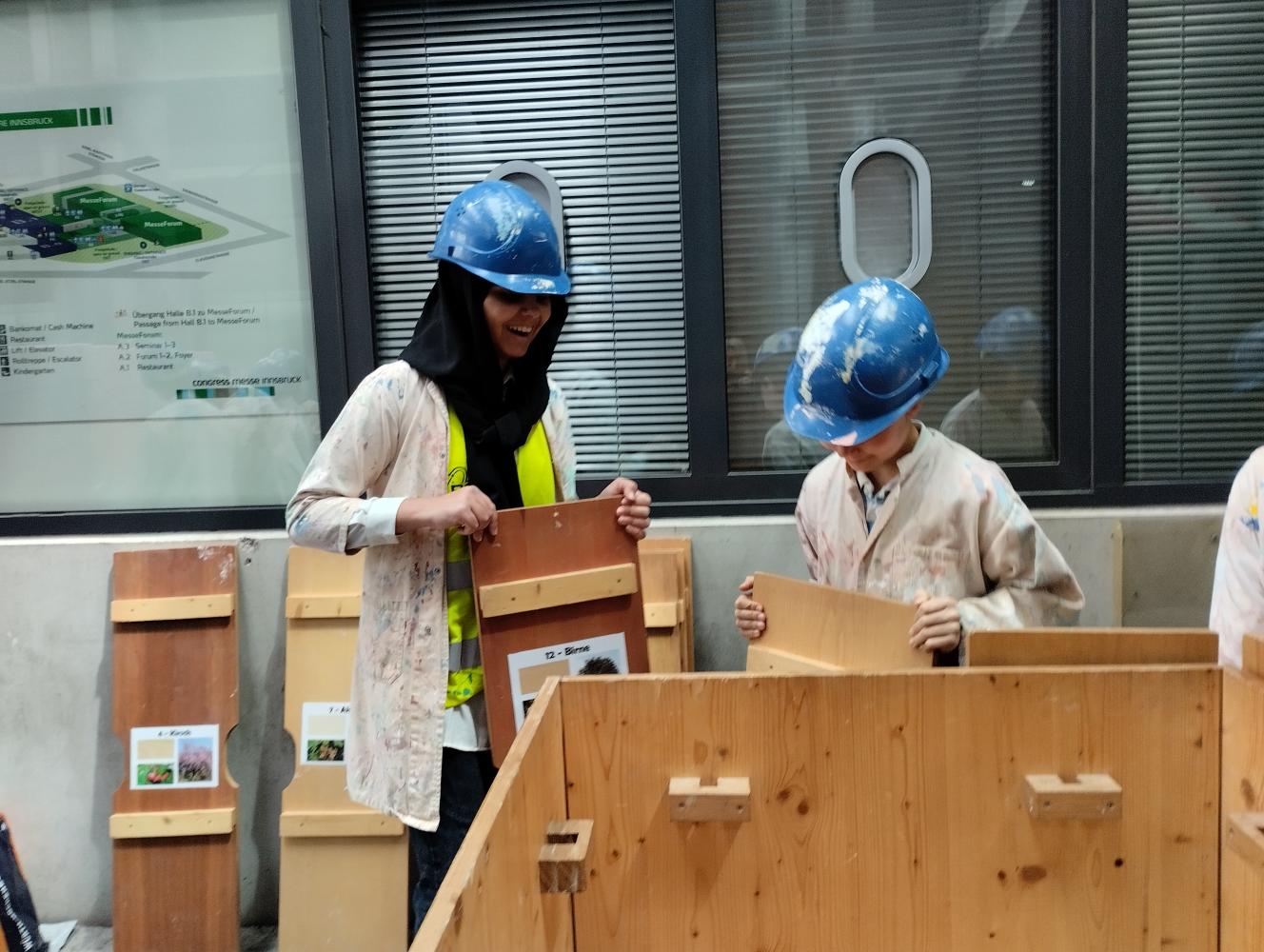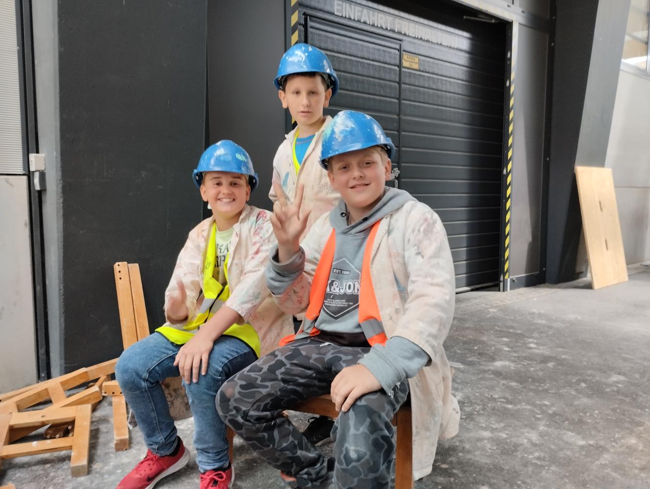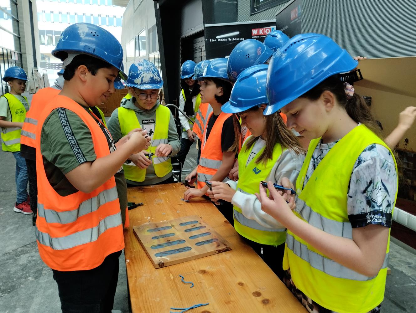 Mit diesen Fragen setzten sich die 1a und die 1c im Rahmen des Projekts „Erlebniswelt Baustelle“ in der Innsbrucker Messe auseinander. Die Schüler*innen konnten spielerisch in 14 Berufe hineinschnuppern, die es für die Errichtung von Bauwerken braucht – vom Bodenleger über den Maurer, Zimmerer, Elektriker und Installateur bis hin zum Dachdecker, Glaser, Spengler und Metallbautechniker. Im Anschluss an eine kurze Berufserklärung konnten die Kinder an einzelnen Stationen berufstypische Tätigkeiten gleich ausprobieren: In kleinen Gruppen durften sie planen, tischlern, zimmern, mörteln, mauern, pflastern, zimmern, biegen und vieles mehr. Alle waren mit viel Eifer dabei, die gestellten Aufgaben zu erfüllen. Dabei kam der Spaß nicht zu kurz, ebenso wie die Erfahrung, dass so eine Tätigkeit auch anstrengend sein kann.