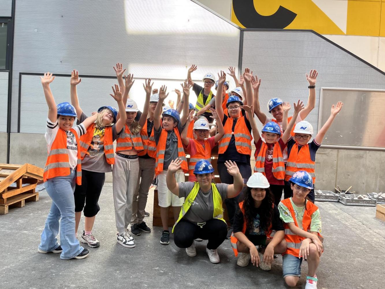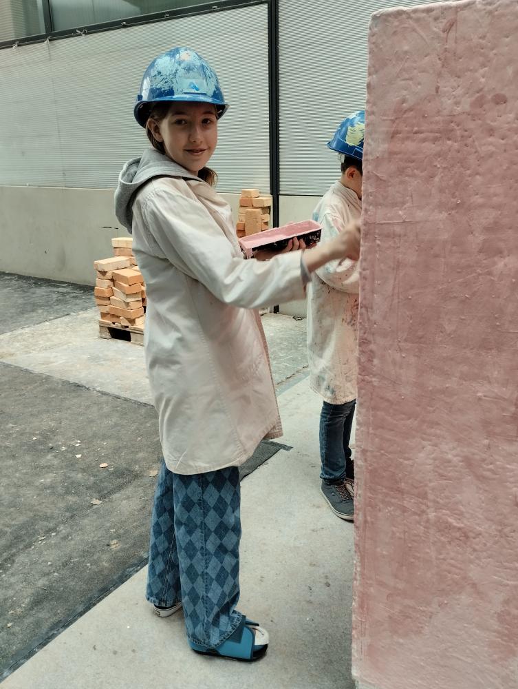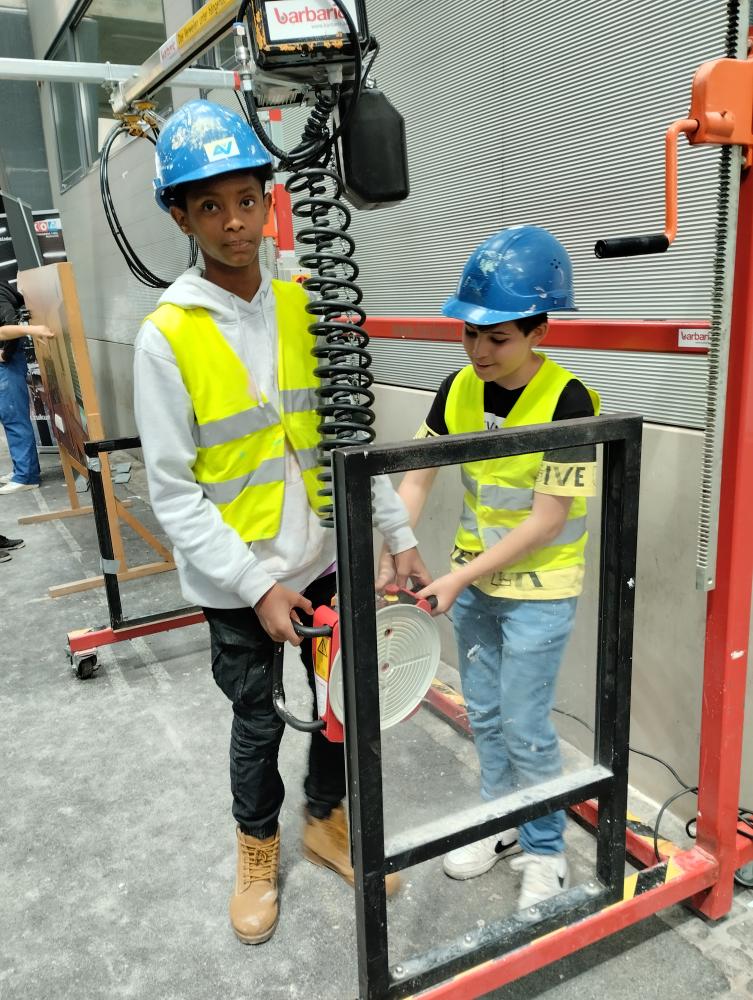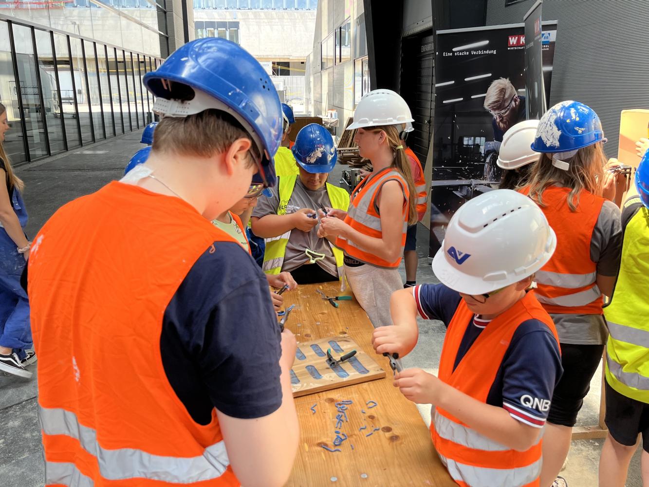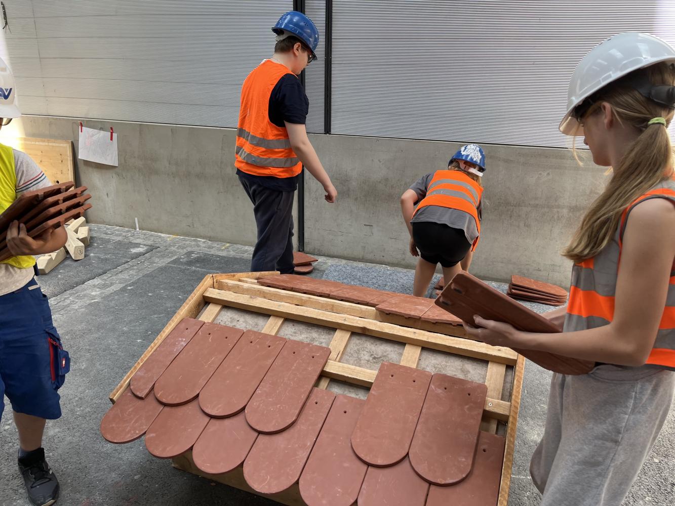 Mit diesen Fragen setzten sich die 1a und die 1c im Rahmen des Projekts „Erlebniswelt Baustelle“ in der Innsbrucker Messe auseinander. Die Schüler*innen konnten spielerisch in 14 Berufe hineinschnuppern, die es für die Errichtung von Bauwerken braucht – vom Bodenleger über den Maurer, Zimmerer, Elektriker und Installateur bis hin zum Dachdecker, Glaser, Spengler und Metallbautechniker. Im Anschluss an eine kurze Berufserklärung konnten die Kinder an einzelnen Stationen berufstypische Tätigkeiten gleich ausprobieren: In kleinen Gruppen durften sie planen, tischlern, zimmern, mörteln, mauern, pflastern, zimmern, biegen und vieles mehr. Alle waren mit viel Eifer dabei, die gestellten Aufgaben zu erfüllen. Dabei kam der Spaß nicht zu kurz, ebenso wie die Erfahrung, dass so eine Tätigkeit auch anstrengend sein kann.