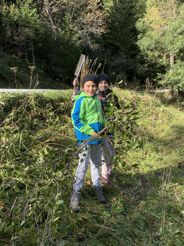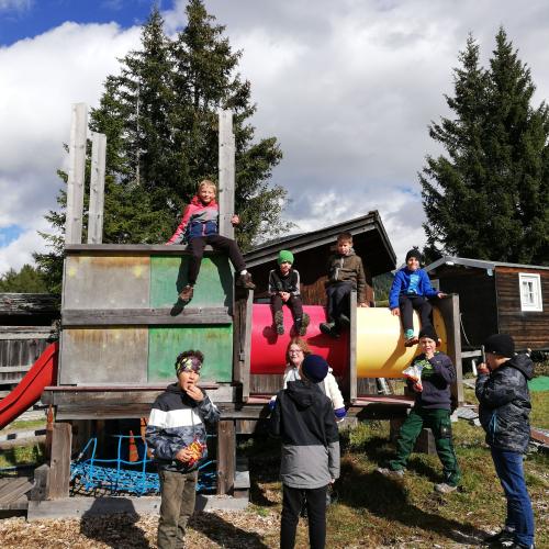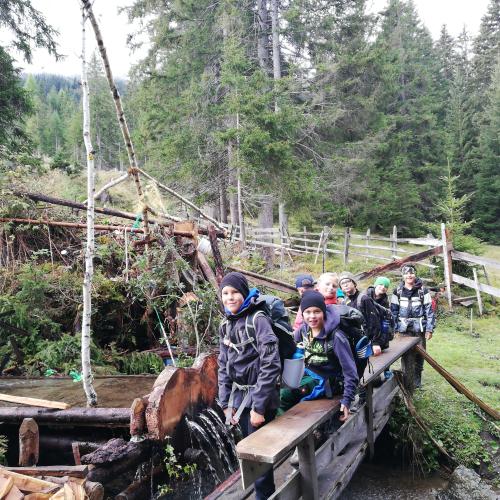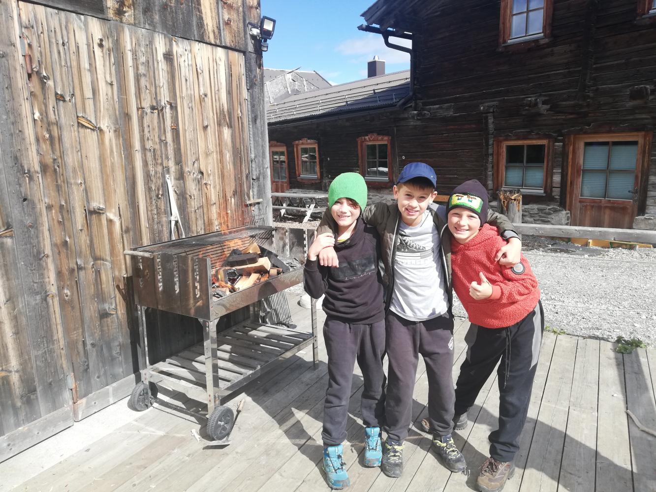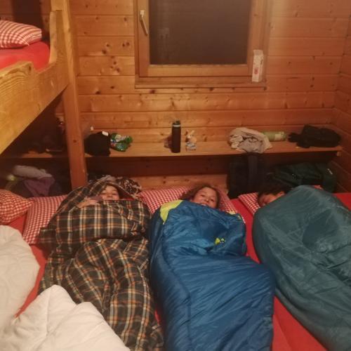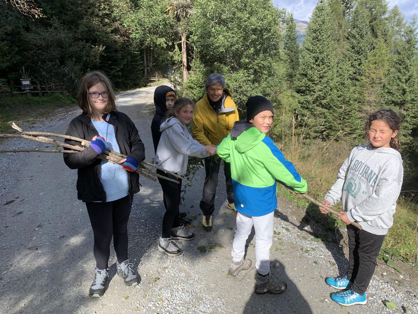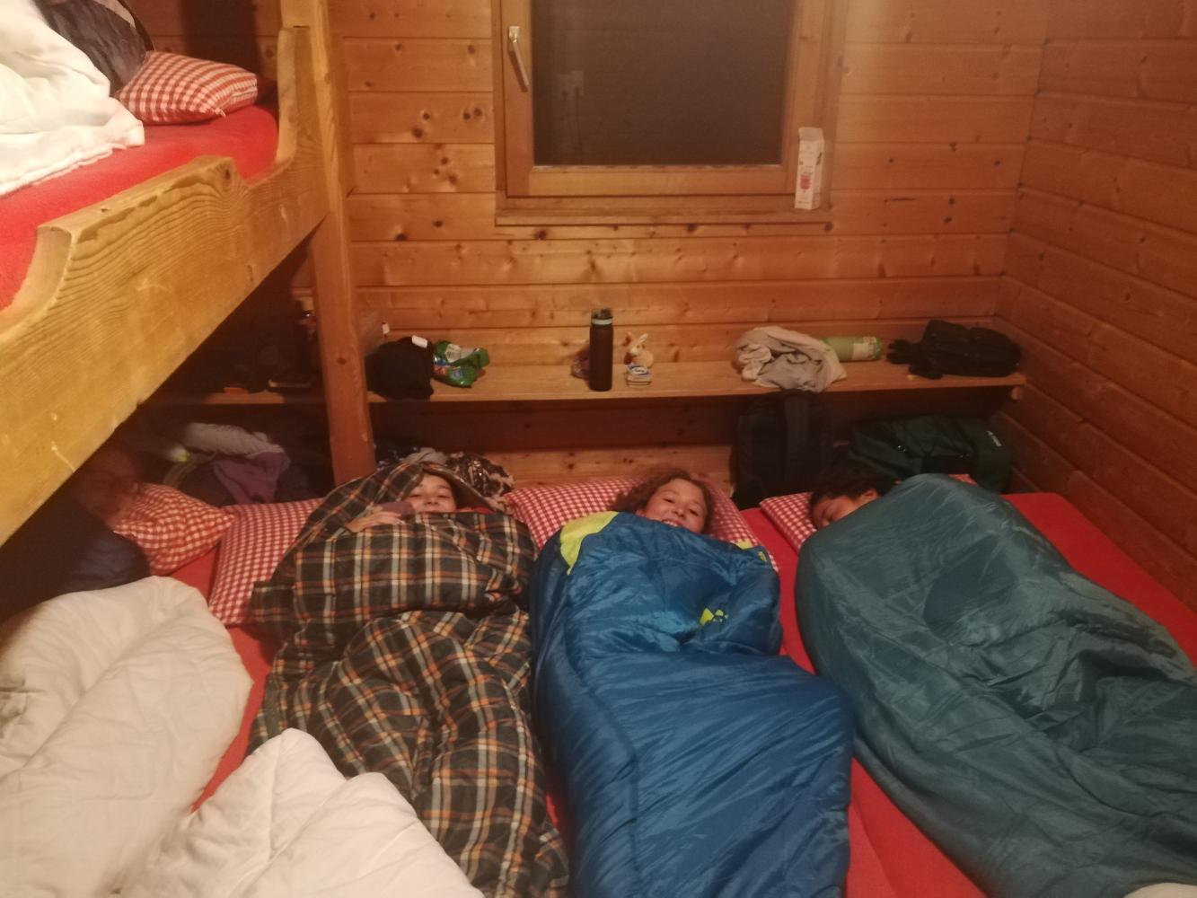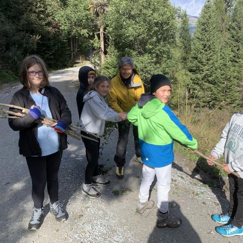 Zimmer beziehen, essen, trinken, gemeinsam spielen, kooperieren, Nachtwanderung „Hier im Wald ist unheimlich! Können wir bitte wieder in die Hütte gehen?“ in kleinen Lagern zu dritt oder fünft, und jeder in seinem Schlafsack schlafen (die einen mehr die anderen weniger Stunden pro Nacht. Manche Kinder sind echte Frühaufsteher, haben wir kennen gelernt ☹) mit kleinen Sägen Äste fürs Stockbrot herstellen, Rinde abmachen, Feuer machen und Würstchen grillen und Stockbrot backen. Gesättigt wieder ins Tal und mit dem Zug zurück.