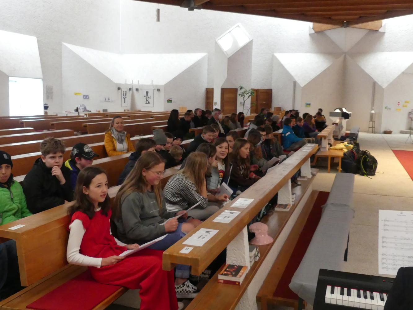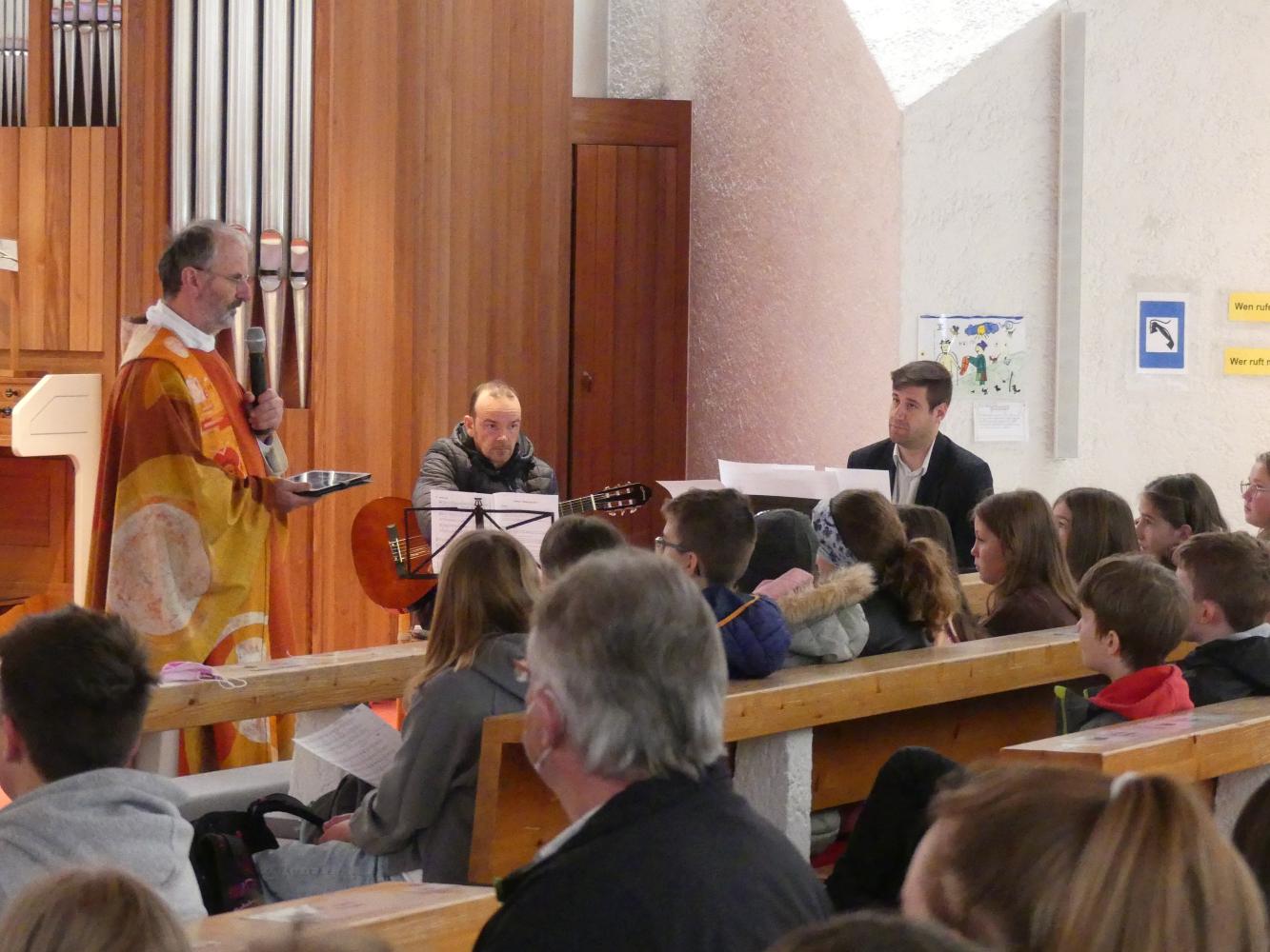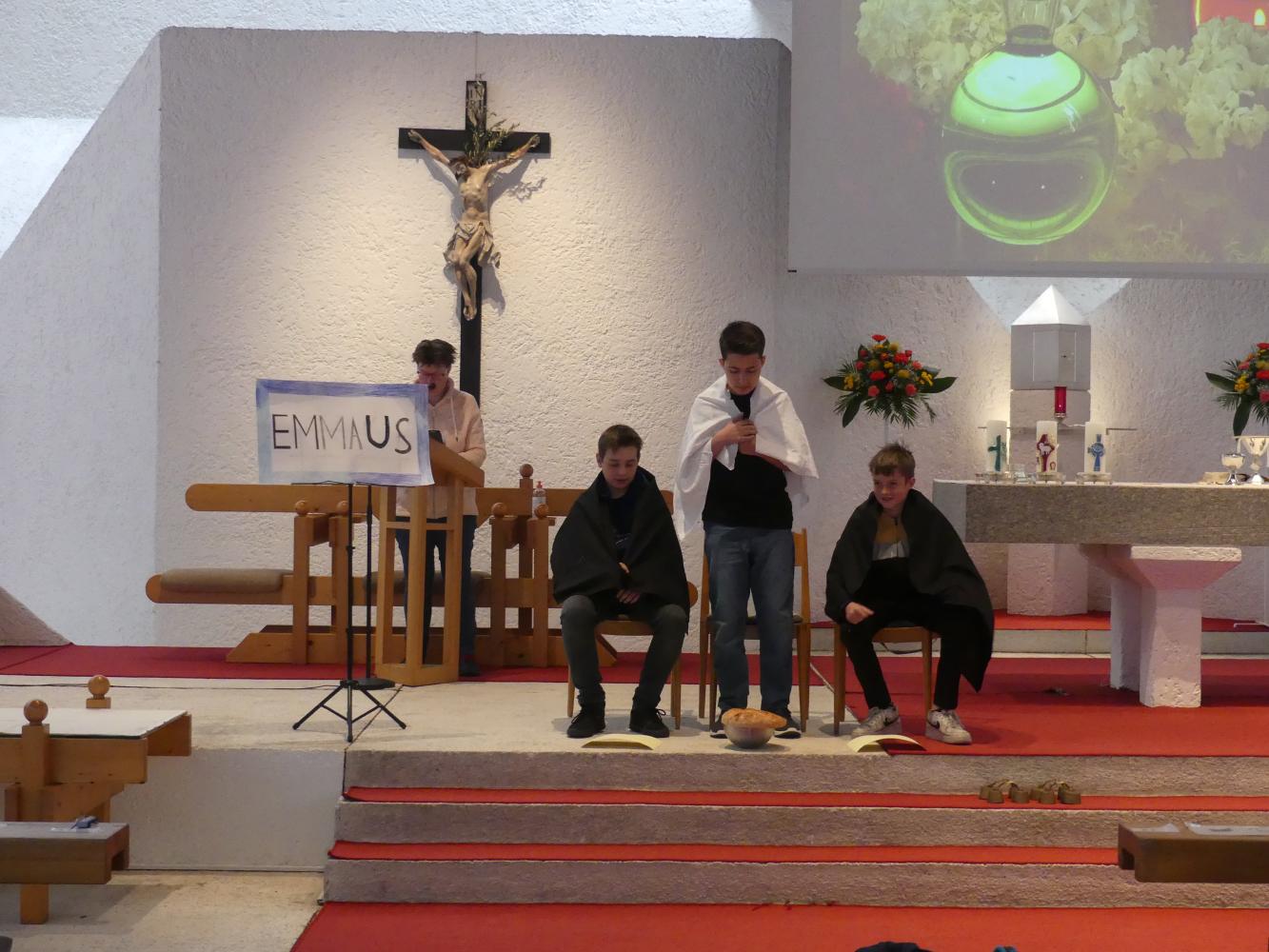 Die dritten Klassen brachten uns die Emmaus-Geschichte mit einem Rollenspiel näher, welches im Religionsunterricht einstudiert wurde. Die vierten Klassen kümmerten sich umdie Fürbitten. Jeder trug seinen Teil zum Gelingen des Gottesdienstes bei.