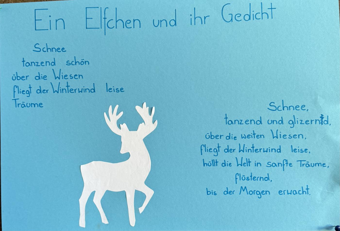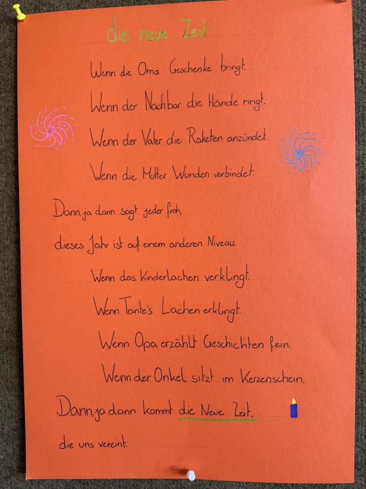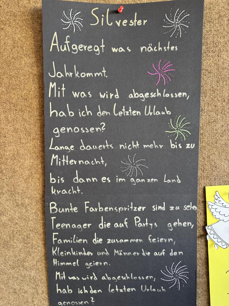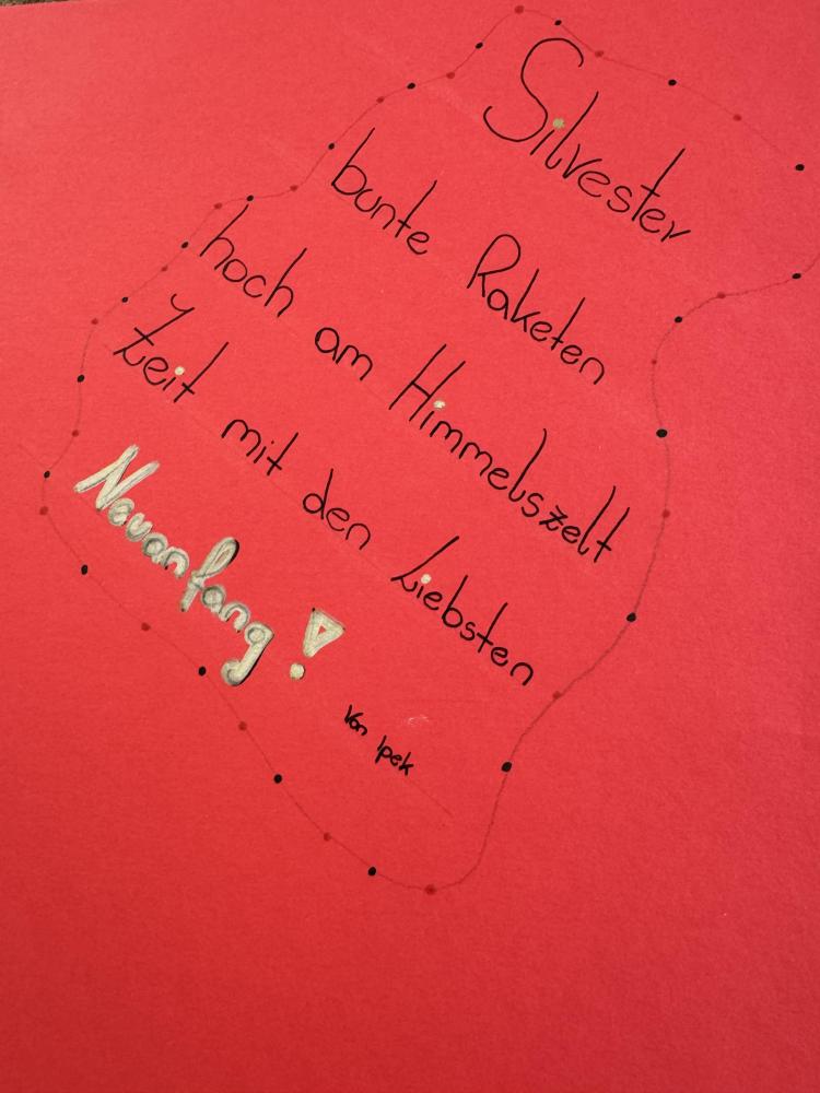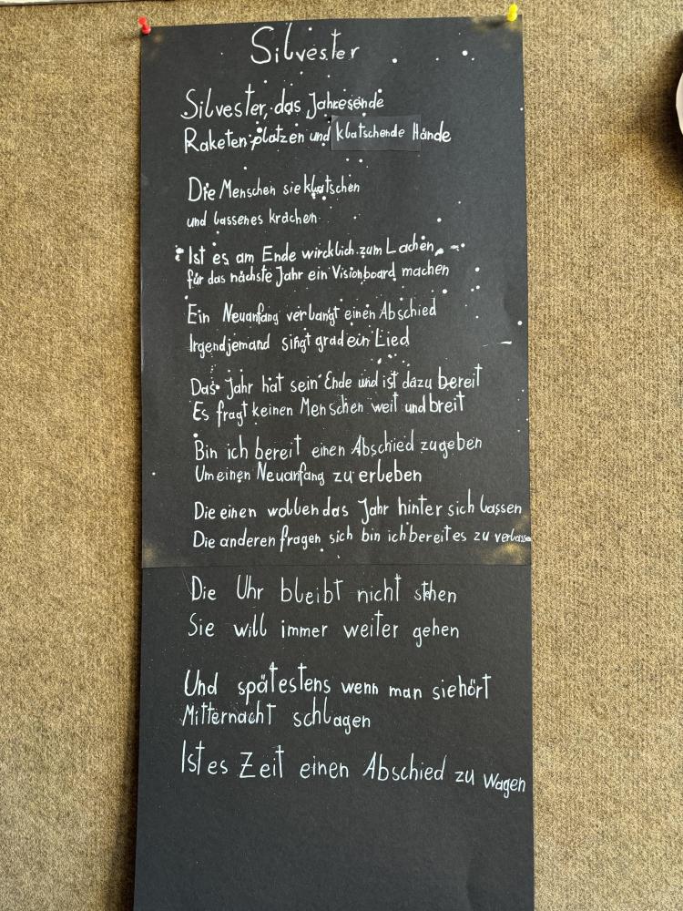 Themenvorgabe war entweder "Weihnachten" oder "Neujahr, Silvester, Neubeginn". Wer wollte, konnte ein Elfchen, bestehend aus 11 Wörtern mit genauer Formvorgabe (1. Zeile: 1 Wort, 2. Zeile: 2 Wörter, 3. Zeile: 3 Wörter, 4. Zeile: 4 Wörter und abschließend ein Wort, dass die vorige Thematik zusammenfasst), schreiben. Wer sich wohler fühlte, mehr Wörter zu gebrauchen, durfte natürlich auch ein gängiges Gedicht schreiben.