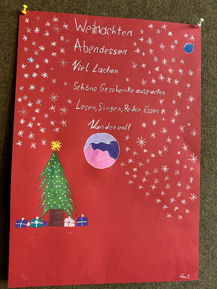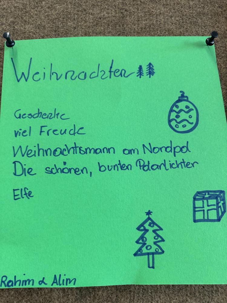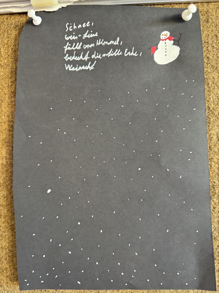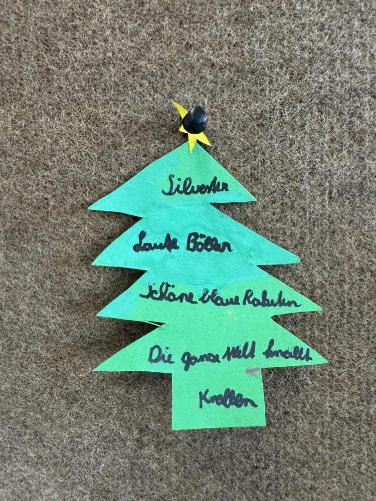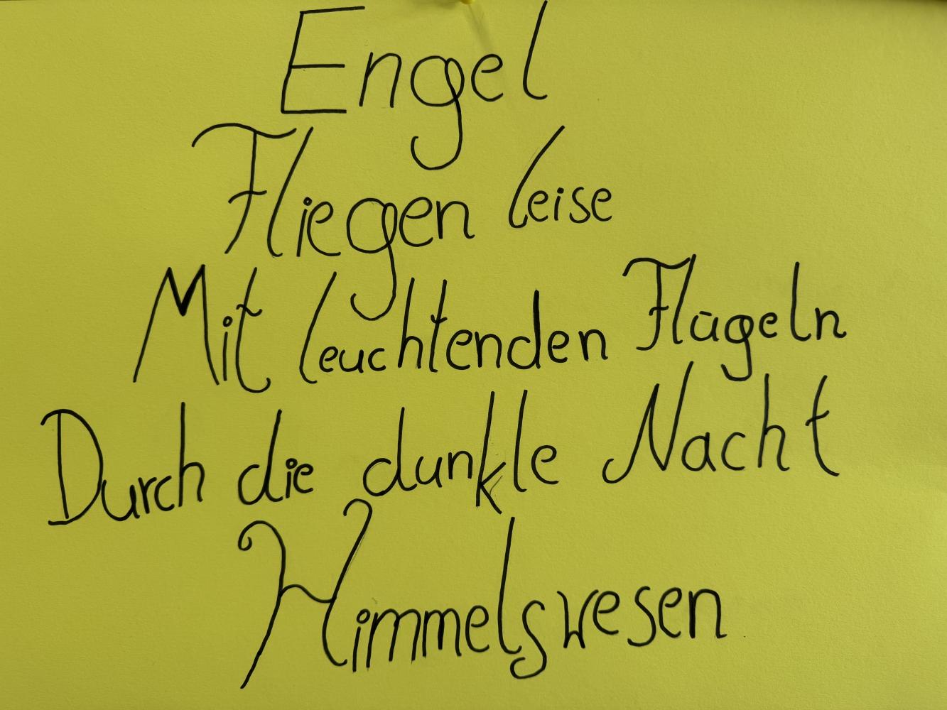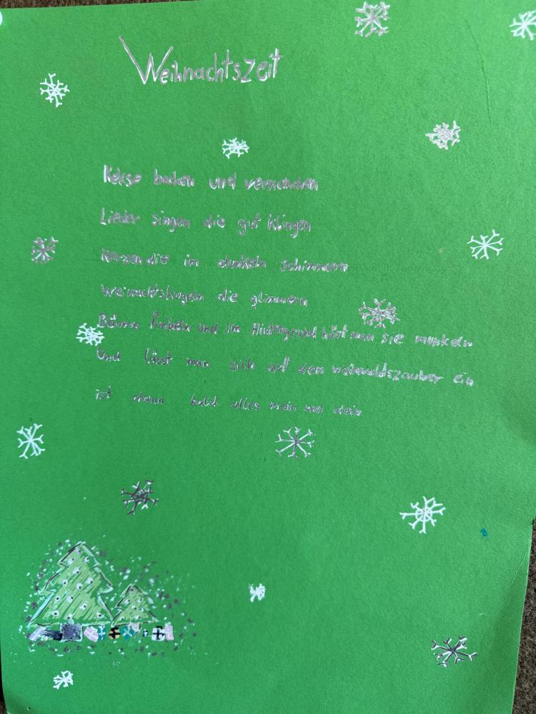 Themenvorgabe war entweder "Weihnachten" oder "Neujahr, Silvester, Neubeginn". Wer wollte, konnte ein Elfchen, bestehend aus 11 Wörtern mit genauer Formvorgabe (1. Zeile: 1 Wort, 2. Zeile: 2 Wörter, 3. Zeile: 3 Wörter, 4. Zeile: 4 Wörter und abschließend ein Wort, dass die vorige Thematik zusammenfasst), schreiben. Wer sich wohler fühlte, mehr Wörter zu gebrauchen, durfte natürlich auch ein gängiges Gedicht schreiben.