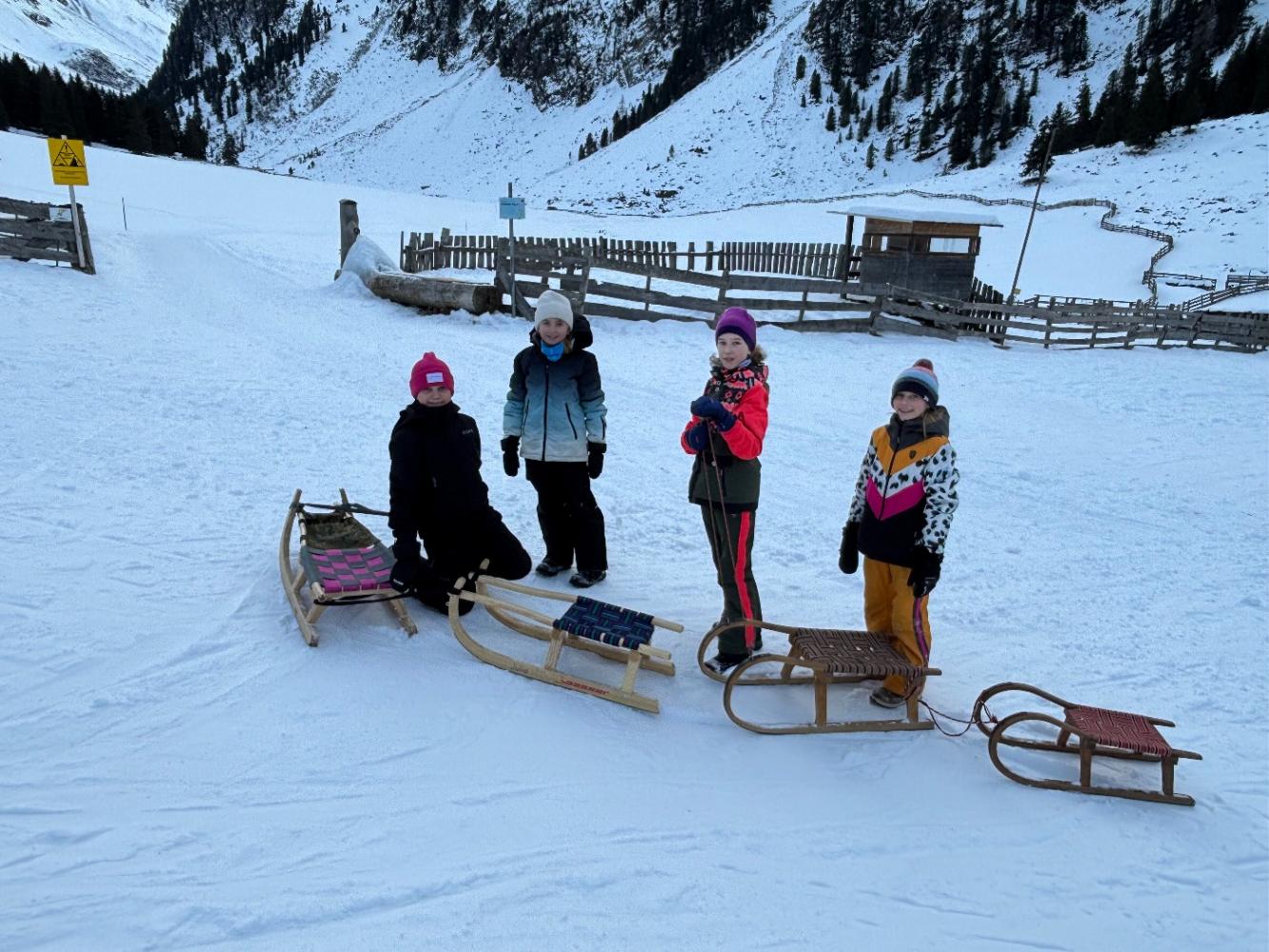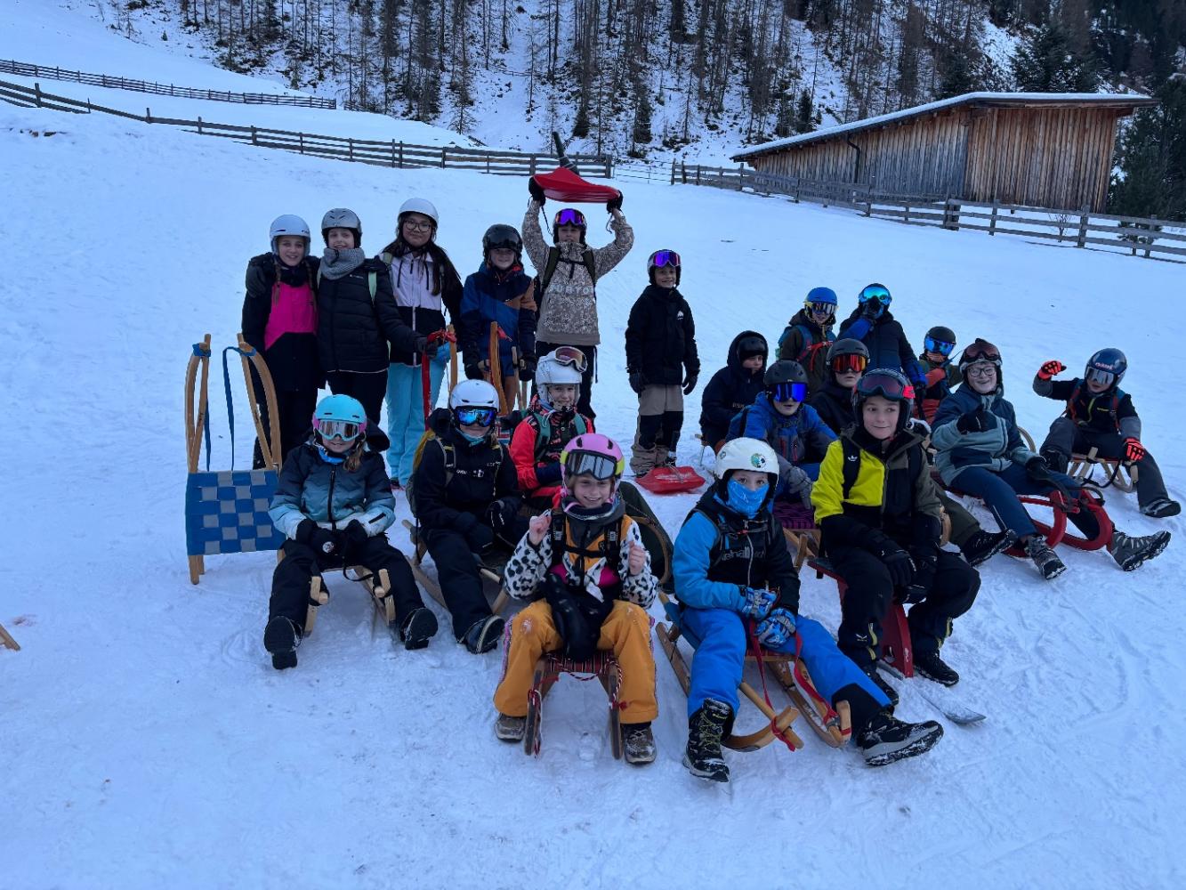 Das Beste kam dann beim Hinunterfahren: Wir sausten mit Rodeln, Schlitten, Zipfelbobs und sogar mit einem selbstgebauten Skibob ins Tal hinunter. Das hat riesigen Spaß 🤩 gemacht! Zwischendurch gab es natürlich auch Schneeballschlachten, Herumtollen im Schnee und ganz viel Gelächter 😃.