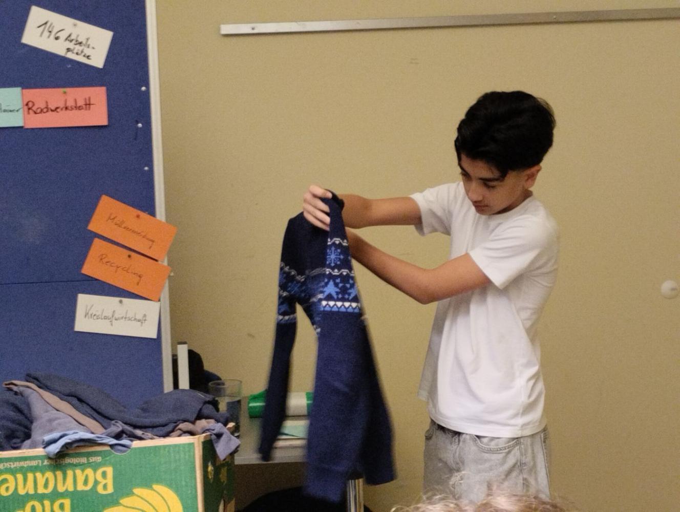 Nach der Einführung durften die Schüler*innen gemeinsam mit Frau Millebner eine Spenden-Schachtel durchsehen und üben, wie man brauchbare von unbrauchbarer Kleidung unterscheidet – eine praktische Erfahrung, die zum Nachdenken über Konsumverhalten anregte. So stammten doch mehrere qualitativ minderwertige Textilien von einem bekannten chinesischen Billigproduzenten. Frau Millebner erklärte uns das Prinzip der „Ultra Fast Fashion“: Tausende Kleidungsstücke einer neuen Kollektion werden online gestellt und nur tatsächlich produziert, wenn sie genügen Klicks von potentiellen Käufern bekommen. Auch auf die Arbeitsbedingungen und die Entlohnung der chinesischen Wanderarbeiter wurde eingegangen.