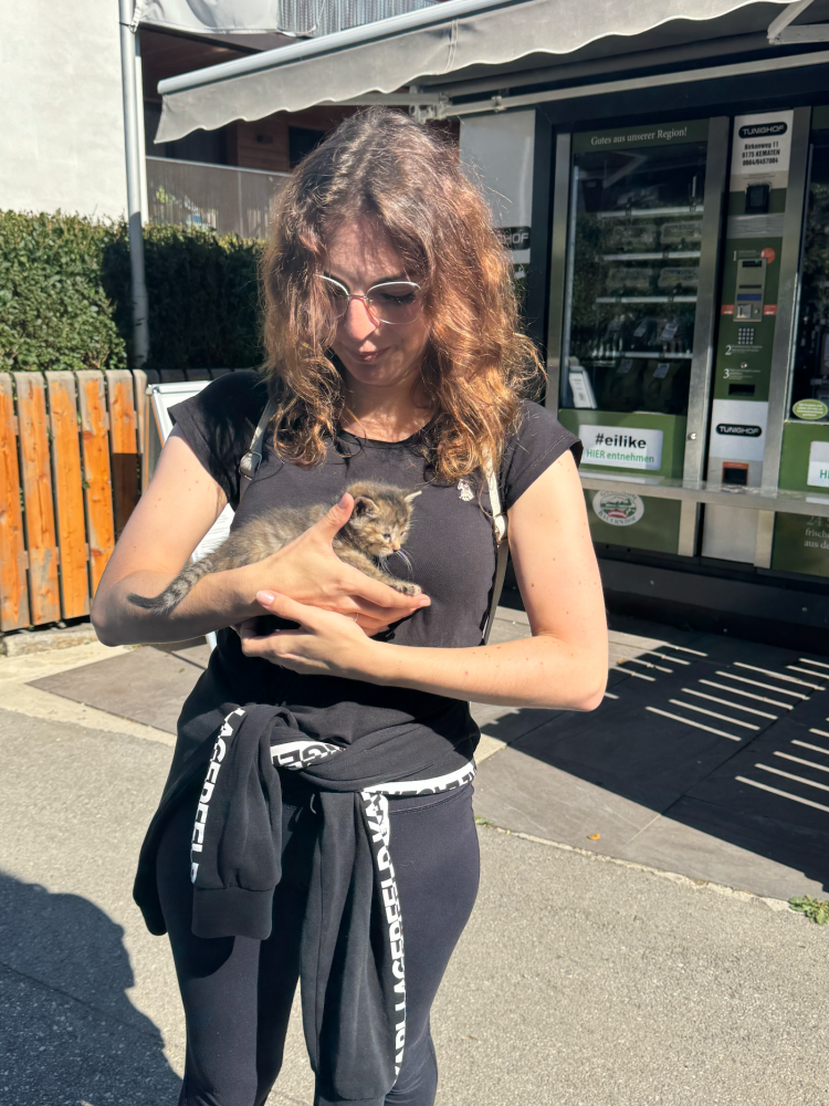 Um 11:00 Uhr ging es über einen schattigen Feldweg nahe dem Wald wieder zurück nach Völs. Ein ganz besonderes Highlight war dabei die Begegnung mit einem kleinen Kätzchen, das auf einer Straße unterwegs war. Dank des behutsamen Einsatzes von Delia Desto, Alessandro und einigen Helfern konnte es sicher in einen nahegelegenen Garten gebracht werden.