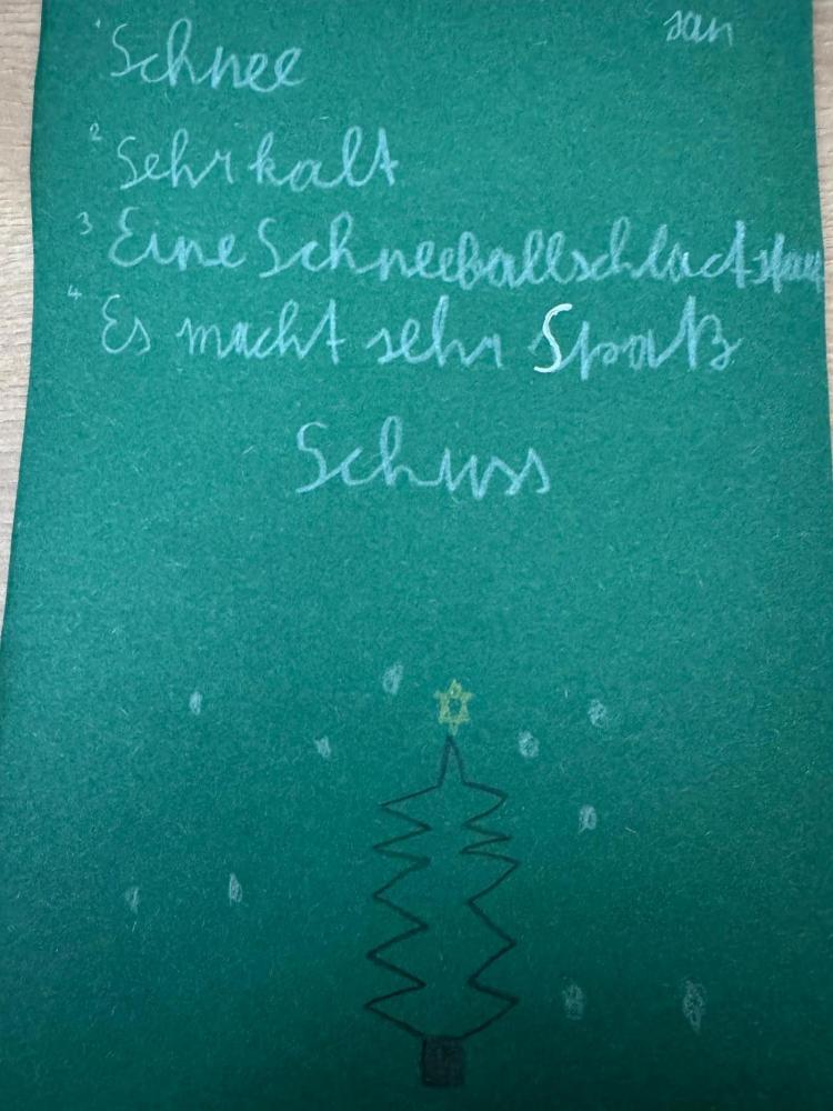 In den Klassen 1a und 1c wurde es poetisch: Unsere Schüler:innen haben eigene Wintergedichte in der Form eines Elfchens geschrieben. Inspiriert von Kälte, Winter, Schnee und dem Neujahr entstanden viele kreative Texte. Die besten Elfchen wurden ausgewählt und zeigen, wie viel Fantasie und Sprachgefühl schon in den ersten Klassen steckt.