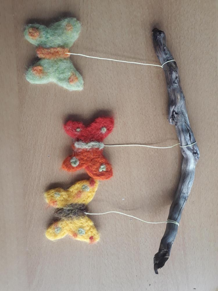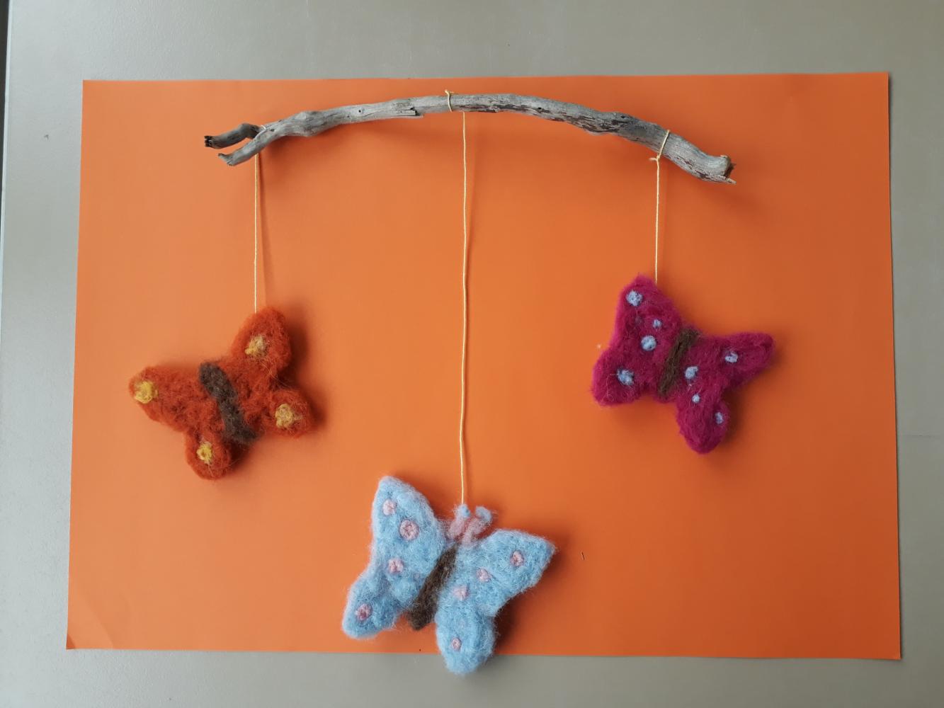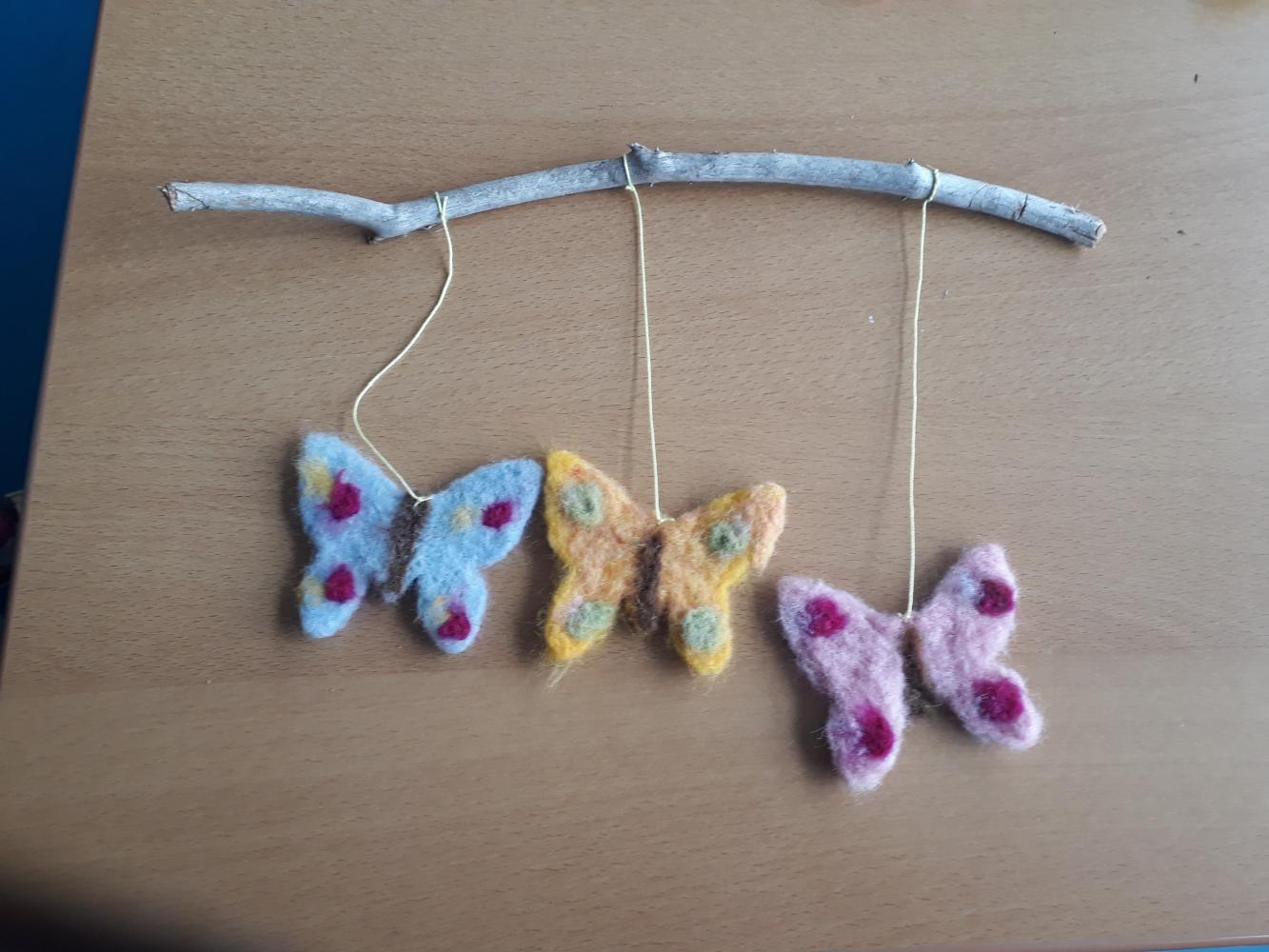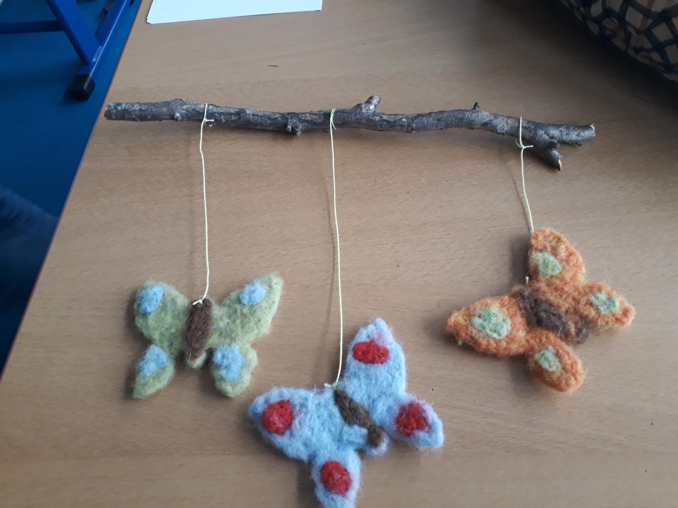 So gestalteten die Schüler der 1. Klassen der MS Völs mittels dieser Technik farbenfrohe Schmetterlings-Mobiles.